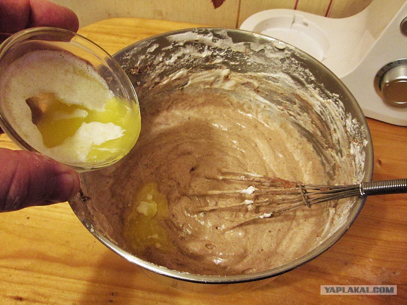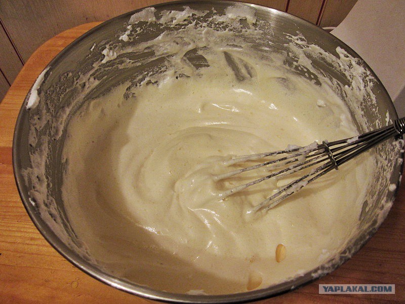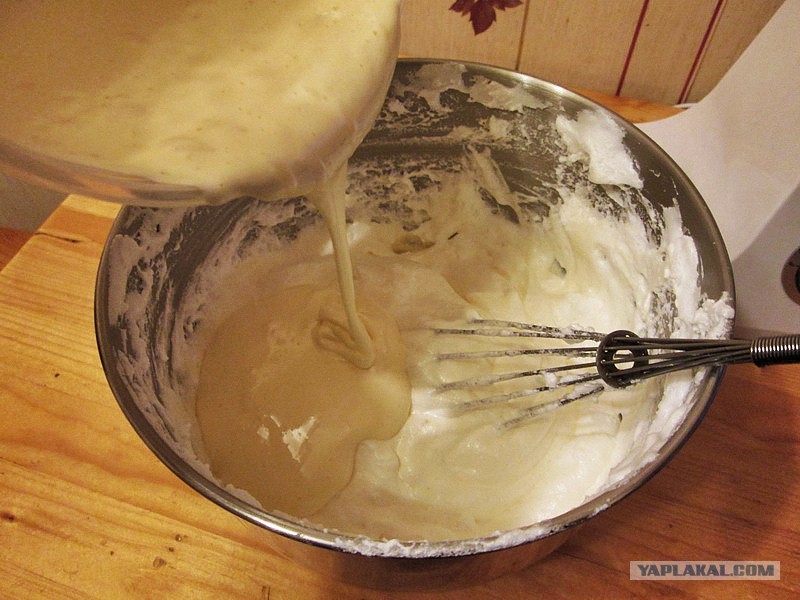 Теперь ответственный момент наступает. Надо все соединить и размешать. Соединять надо быстро. Размешивать аккуратно, что б «воздушность» не убить smile.gif