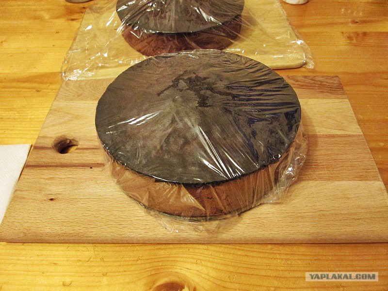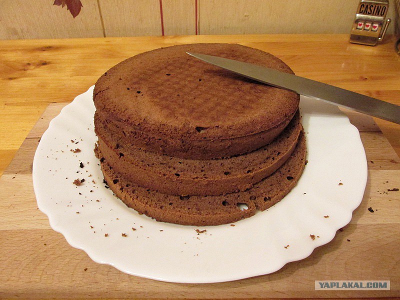 Выстоявшийся бисквит разрезаем на 3 равных по толщине шайбы, коржа smile.gif