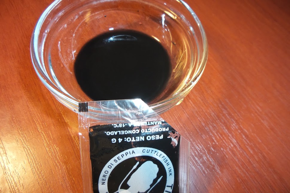 Чернила каракатицы развести в 50 мл воды и добавить в фарш. Вымесить.