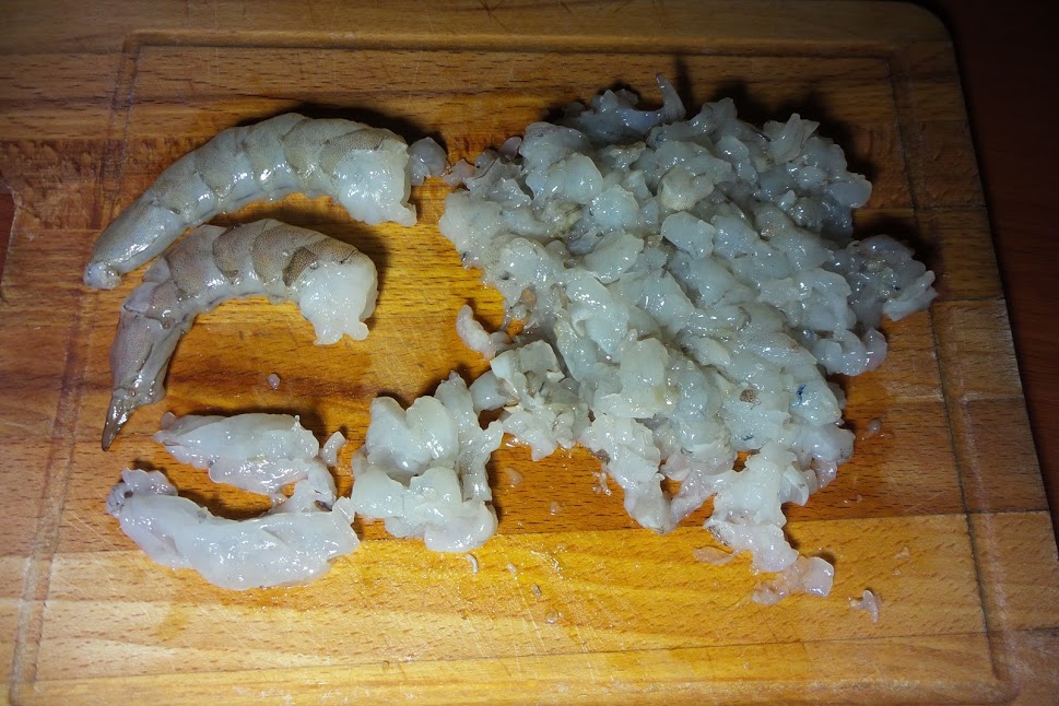 Креветки очистить от панциря, удалить кишечную вену, промыть. Нарезать кусочками 0.5 см.