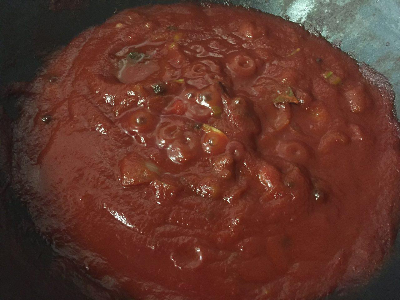 Консистенция соуса такая, что с ложки он у нас особо слезать не стремится. При изготовлении соуса из помидоров в собственном соку по времени на все уходит 30-40 минут. В моем же случае пришлось выпаривать обычный томатный сок, что по времени заняло несколько больше.