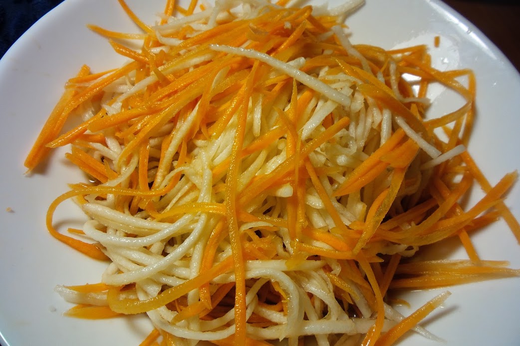 Тем временем нашинковать морковь и дайкон, смешать воду, уксус соль и сахар. Замариновать их и отставить.