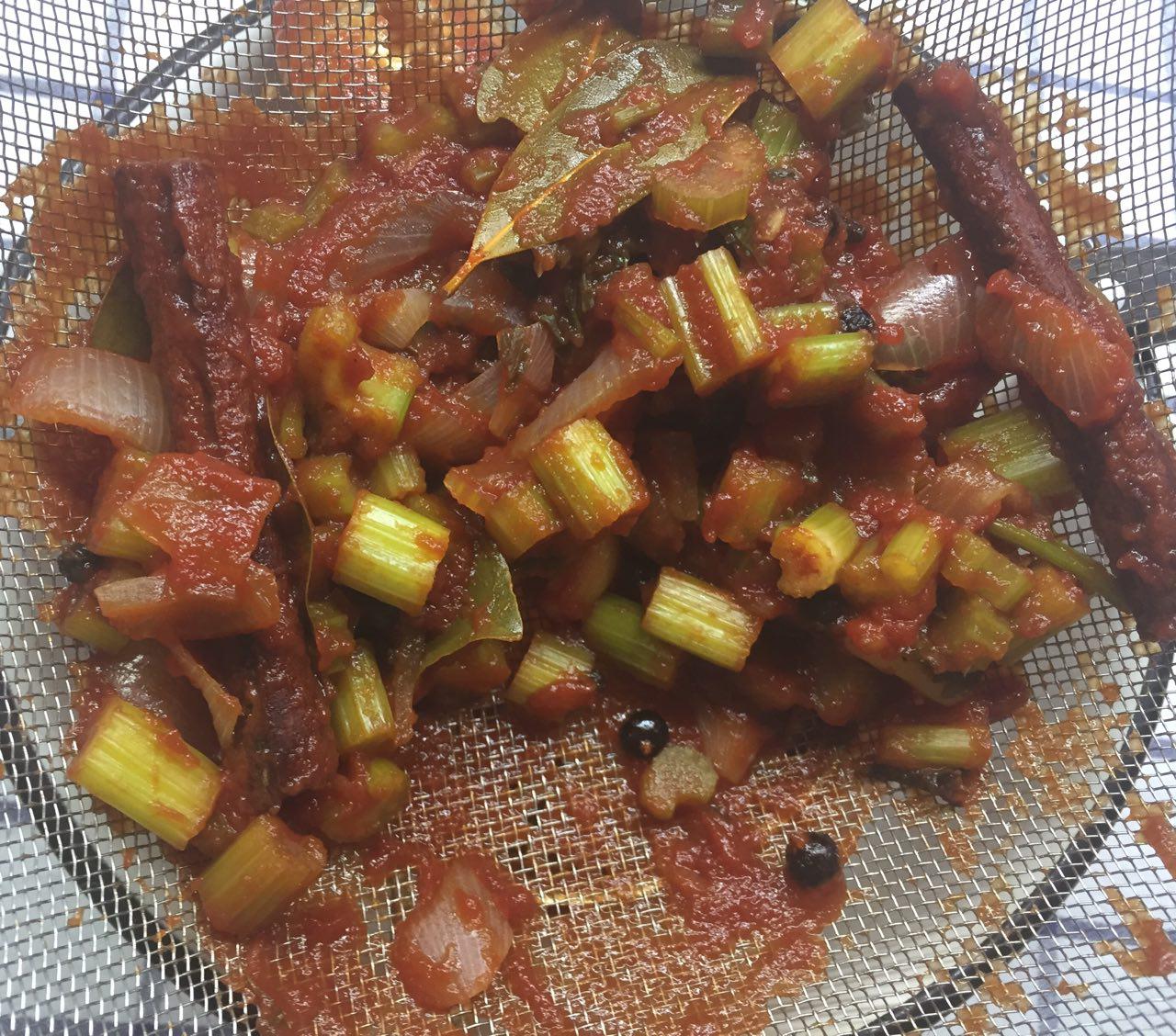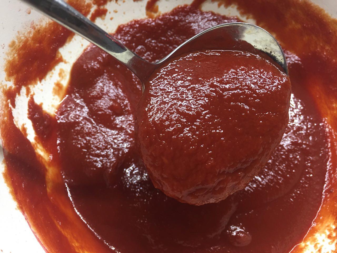 Где-то ближе к концу процесса добавляем соль и базиликовый сироп. Соли с поправкой на то, что в рецепте используются еще и соленые огурцы. Если объем специй я показал, то с солью все по вкусу. В базиликовом сиропе содержится декстроза, которую надо подружить с кислотностью помидорной массы. Добавляем как и соль, исключительно небольшими порциями. Обычно уходит 2-3 столовые ложки, но тут ушло целых пять. По кетчупной классике конечно же надо было сахар сыпать, но сиропом убиваем сразу двух зайцев. К тому же декстроза в соусе мне ближе сахарозы. Далее мы откидываем всю массу на сито и протираем ложкой какие-то интересные для нас кусочки. Сельдерей, например, мне был не интересен. Он не должен был выделяться из всей истории. Уделил внимание чесноку и луку. На сите остатки после процеживания массы.
