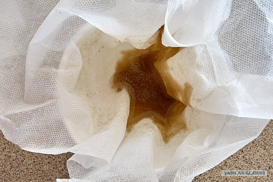 Затем взял нетканый материал плотностью 60-80гр на квадратный метр, вложил в воронку и процедил получившееся. Лёд, само собой, из процесса выкинул вместе с жиром.