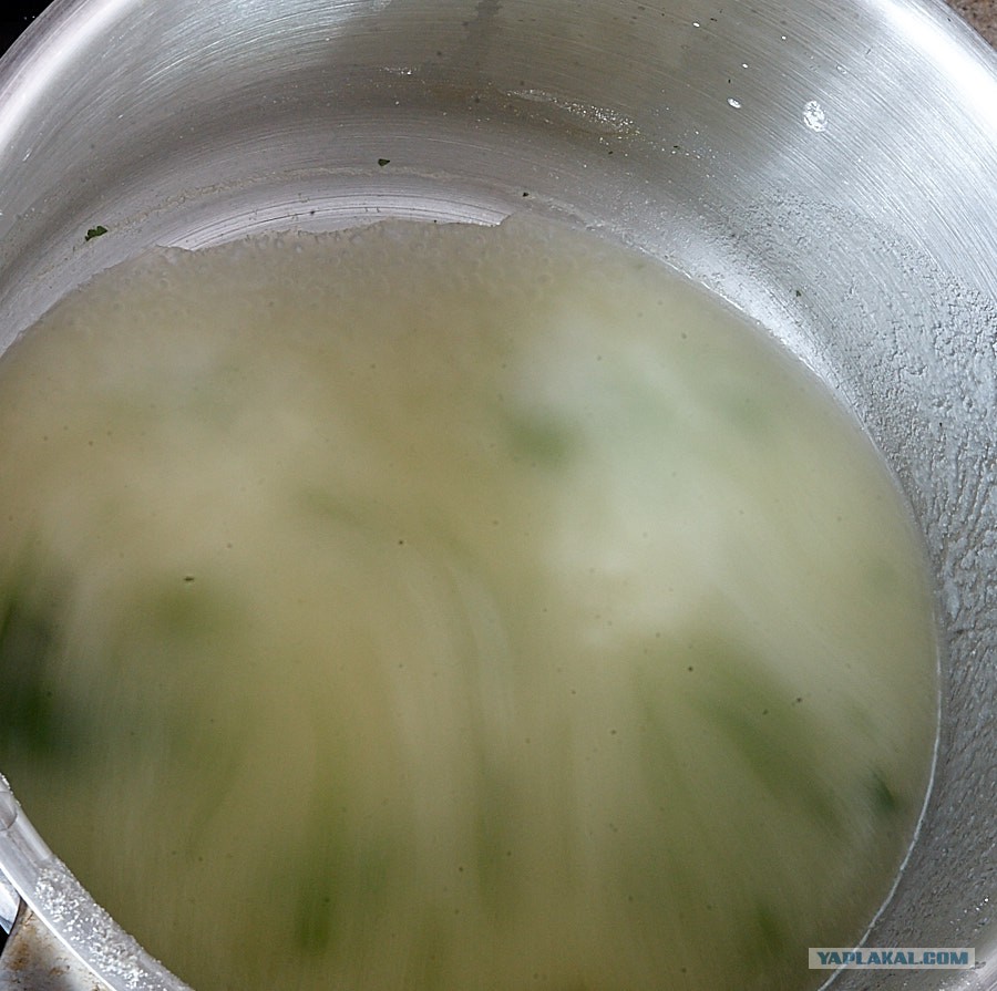 Не, поймите правильно, лично я не против жира в бульоне — просто сегодня высокая грузинская кухня. К тому же, когда речь о тонких вкусах и ароматах, важно не переборщить с душистыми веществами из добавленных мною стрелок зонтичных, которые охотно вобрал в себя жир. Это, как бы так сказать, еще не чай из мяты с кинзой на курином бульоне, но уже с претензией.