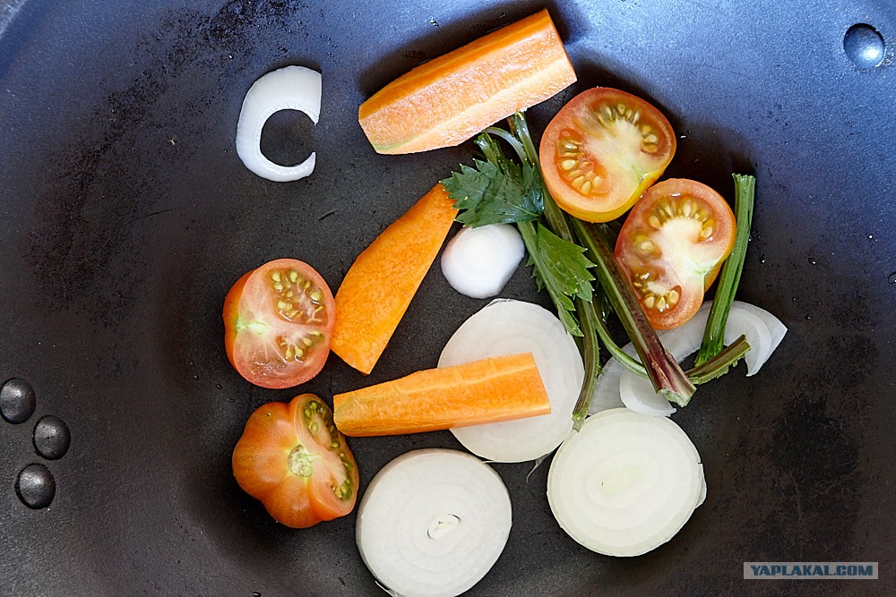Когда хочется биска, то греем овощи на сковородке. Обычный набор для овощного бульона. У меня сельдерей вот такой, но кто-то берет и корневой.