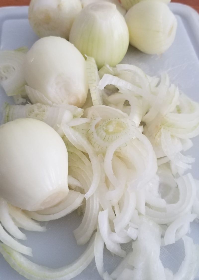 Когда бульон готов , закидываем нарезанный полукольцами лук. Можно поджарить слегка с томатами. Я не стала этого делать, потому что получился крепкий бульон.