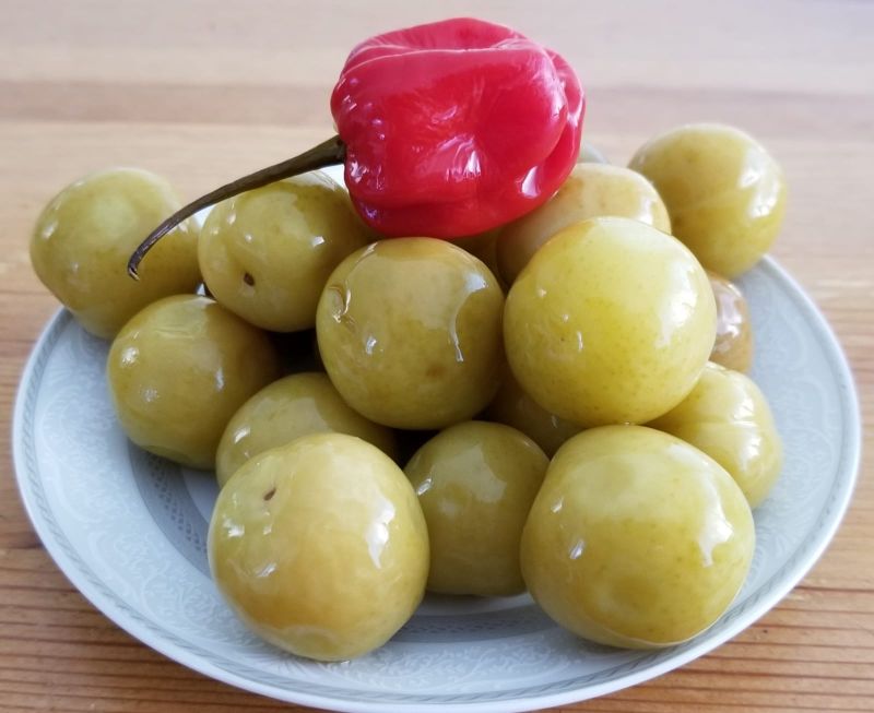 Добавляем маринованную алычу. Я ещё добавила острый перчик,он был у меня в банке с алычой.