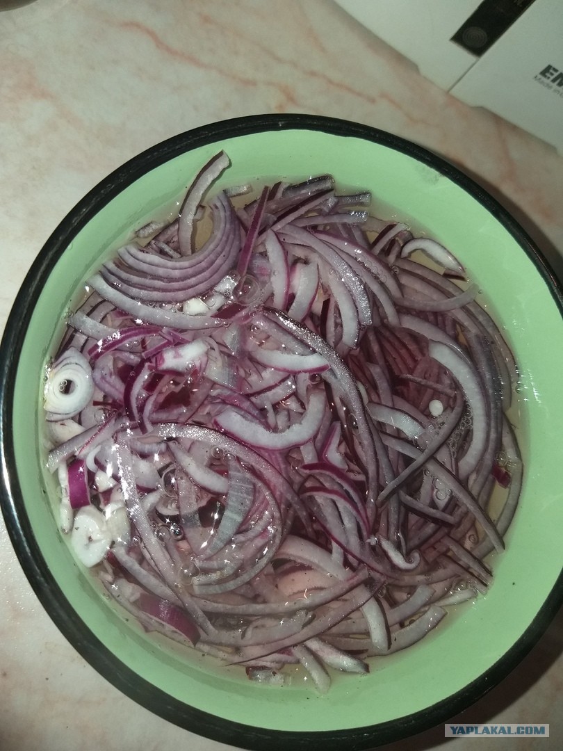 6. Маринад для лука: щепотка соли, 1 ч.л. сахара, 1 ч.л. уксуса