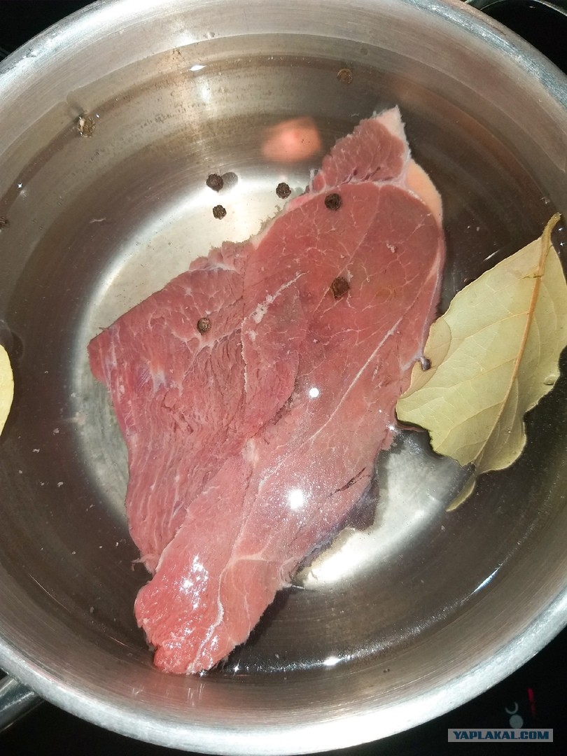 Солю минут за 10-15 до окончания варки, соль также вытягивает жидкость из куска, а нам этого не нужно, поэтому добавлять соль в самом начале не нужно. Пока варится мясо, займёмся другими процессами. Или же вы можете отварить мясо заранее, тогда остальной процесс приготовления этого блюда займёт совсем немного времени.