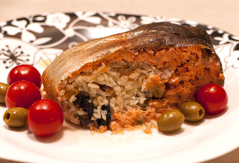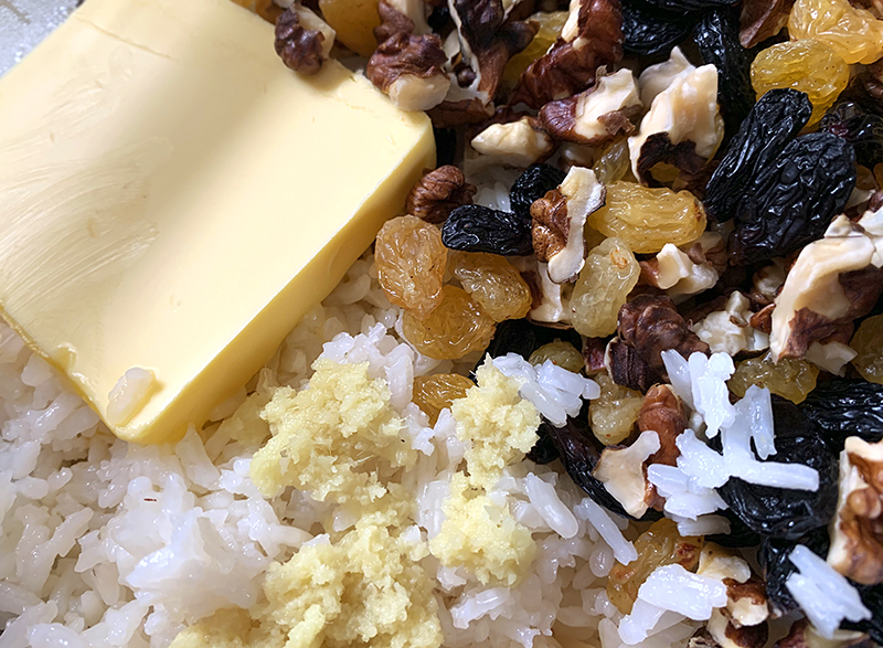 Нужно сварить мягкий рис. Орехи – половина объема риса и столько же кишмиша. Имбирь – по вкусу, на чесночной ложке натереть вхлам. Иногда кладут петрушку и кинзу, но мне кажется, имбиря достаточно, дабы не загромождать вкус рыбы.