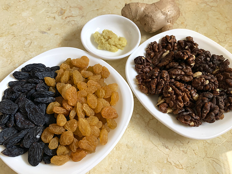 9. Орехи ломаем, вместе с кишмишом моем и обвариваем кипятком.