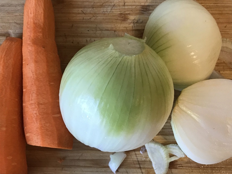 Лук и морковь. Сразу скажу, что было использовано полторы луковицы и полторы морковины. Они довольно здоровые и целиком в мою концепцию не вписывались.