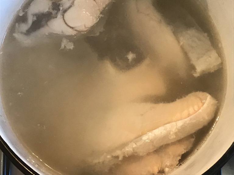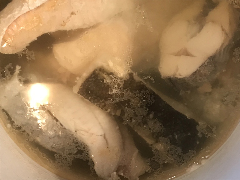 В кастрюлю наливаем воды так, чтобы покрыло рыбу, доводим до кипения.