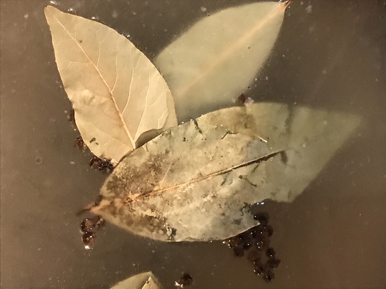 Фильтрую рыбный бульон, переливаю его в казан. Кладу несколько лавровых листьев и горошин чёрного перца. Туда же заливаю остатки огуречного рассола, рассолы от маслин и от оливок.
