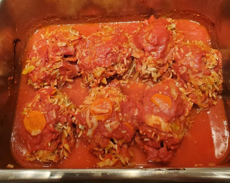 Можно положить голубцы на противень и поставить в духовку, чтобы они схватились, а потом заливать соусом и допекать. Но я делаю совсем ленивые, ленивее не бывает. В противень, на дно, наливаем томатный сок, можно протертые томаты. Укладываем ленивцев. Заливаем сверху томатным соусом.