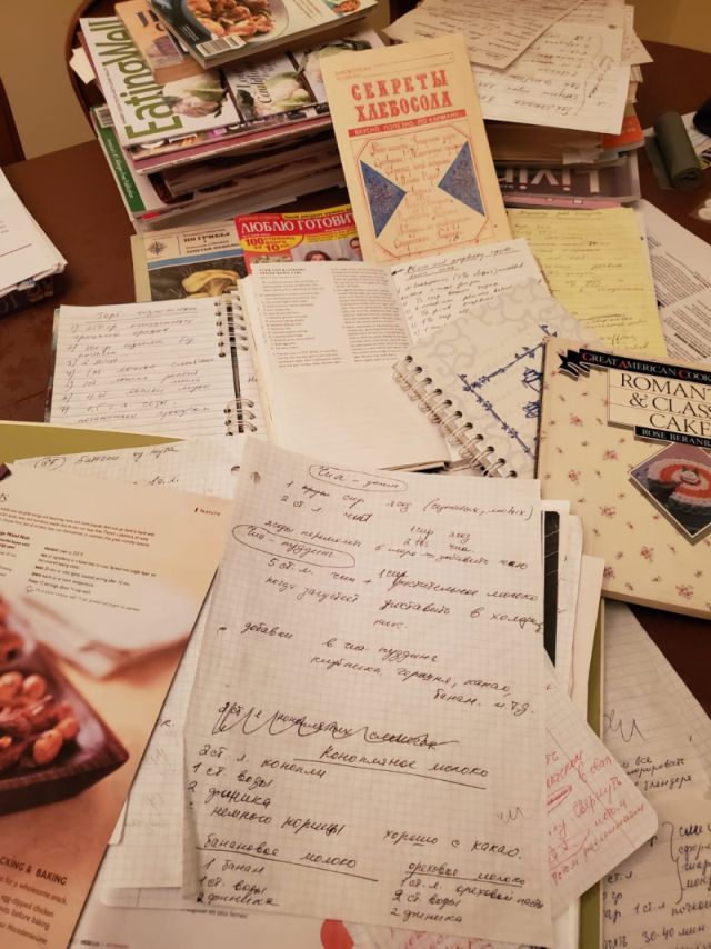 Как стать отличным поваром? Нужен хороший вкус,гибкий ум,нужна ответственность ,пунктуальность, креативность, умение готовить в режиме многозадачности… Ну это всё заумно и трудно совместимо. На самом деле,чтобы стать замечательным поваром достаточно всего две вещи: знания и умение действовать по инструкции. Откуда мы получаем эти кулинарные знания? А начинается всё с рецептов из кулинарной тетрадки! Да, вот так всё просто. И многие помнят эти кулинарные тетради. Это было у бабушек и мам, у родственниц и подруг , это были вырезки с рецептами из журналов и газет, переписанные на листочки рецепты из дефицитных кулинарных книг. И такой кулинарный архив был почти в каждом доме. На фото моя куча рецептов, хорошо,что мы решили сделать флэшмоб к празднику. Я разобрала и аккуратно сложила все бумаги из ящиков. Теперь порядок)))) Я не ожидала, что в моих тетрадках записано столько интересного.