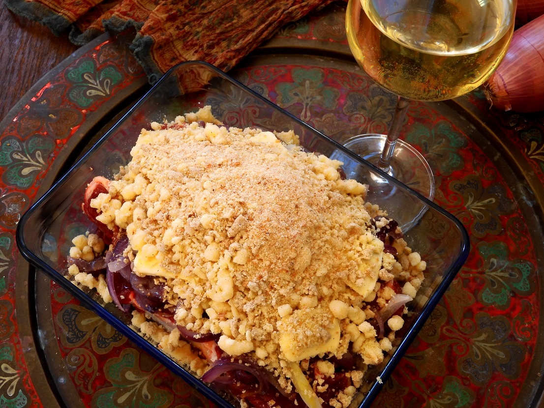 Поверх же лука — первый слой сыра, перемешанного с крупной хлебной крошкой.