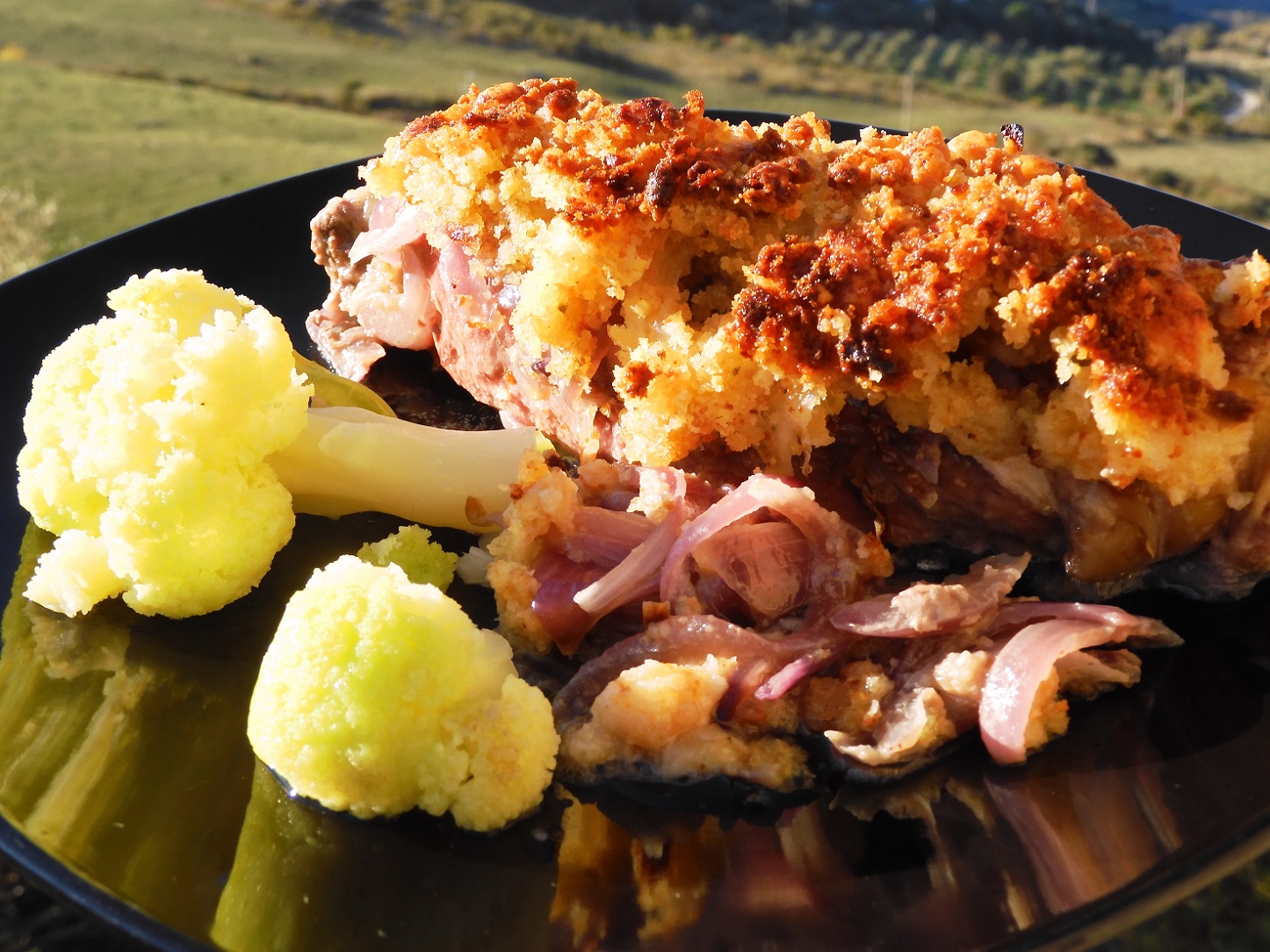 Хлеб раскрошить, перемешать с тертым сыром. Очистить и тонко нарезать лук. Растопить сорок граммов масла в небольшом сотейнике, одновременно на сковородке мягко потомить лук в оставшемся масле, уложить в судок на дно половину лука, на него мясо, сдобрив солью и перцем, и весь остаток лука сверху. Поверх же лука — первый слой сыра, перемешанного с хлебной крошкой. Приминая руками мясо ко дну и поливая растопленным маслом, добавить остальной мякиш, создав подобие купола. Добавив сверху ещё масла, залить мясо до половины крепким бульоном и вином и продержать в печи около получаса, добавляя по надобности вино и бульон. На гарнир рекомендую обжаренную цветную капусту.
