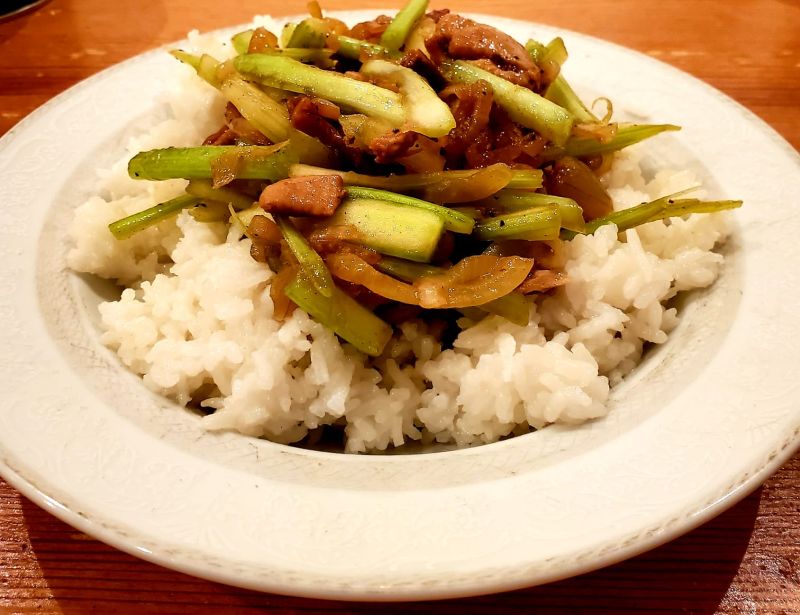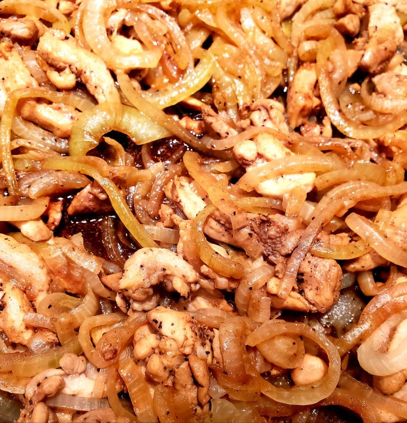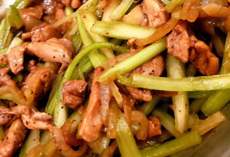 Пока сок стекает с сельдерея, на горячей сковороде нужно обжарить куриное мясо. Потом добавить репчатый лук. Не нужно обжаривать лук до корочки. Как только пропадет луковая резкость и он станет мягким этого будет достаточно. Можно добавить немного сои для приятного цвета. Можно это же сделать с цикорием. Перец и остальные специи добавляйте по-своему вкусу.