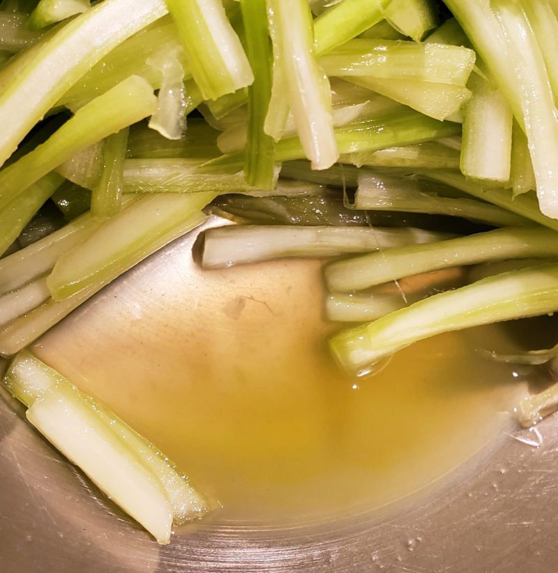 Посыпать сельдерей щепоткой соли ( не пересолите!) и оставить в миске, чтобы стекла лишняя жидкость. Она уже будет не нужна в салате и её можно будет вылить. Или заморозить и потом добавлять в овощной суп. Сельдерей станет гибко-эластичным,но сохранит приятный хруст.