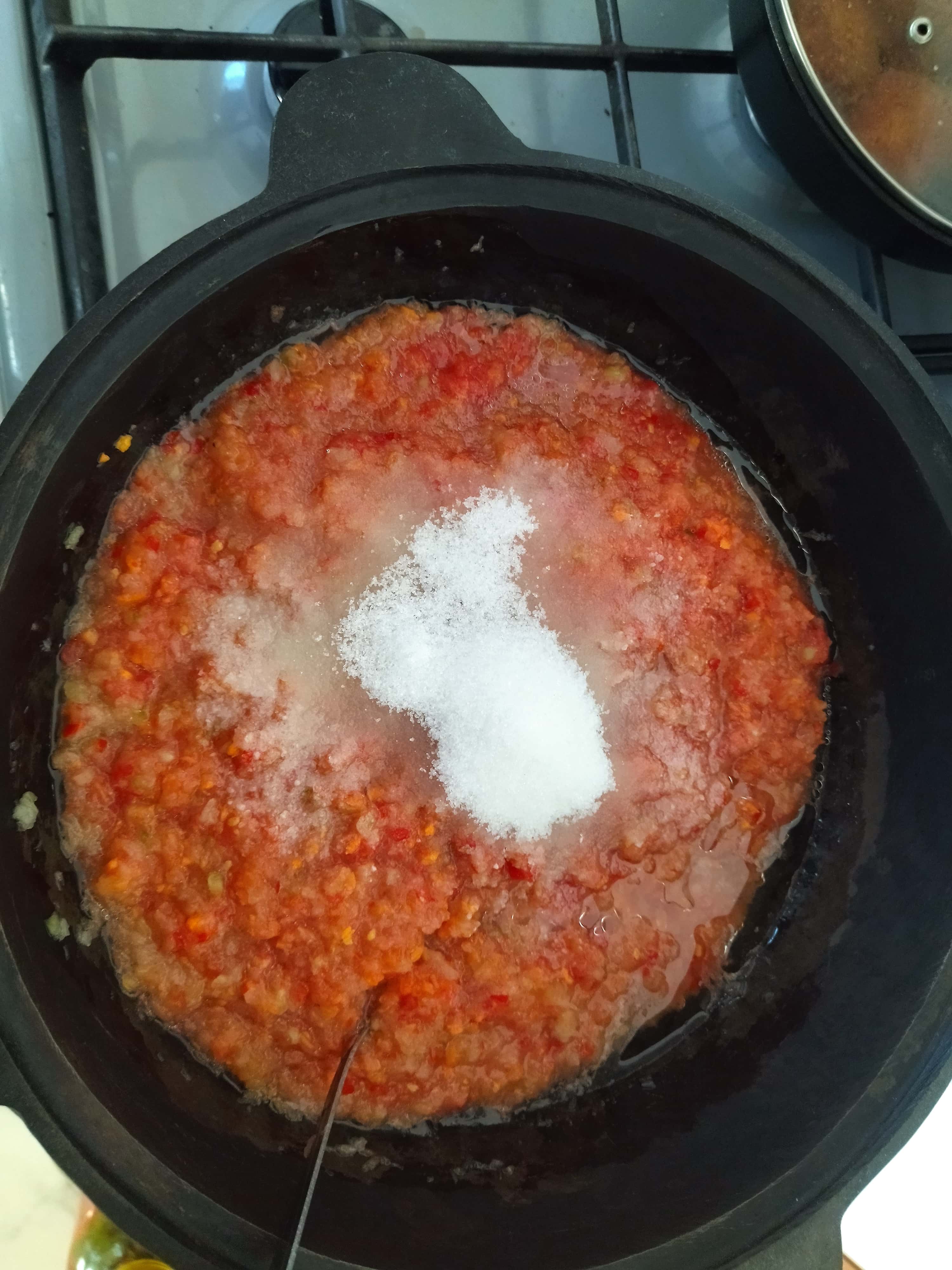 Потом все это в кастрюлю(я варю в казане), добавить соль, сахар и растительное масло.
