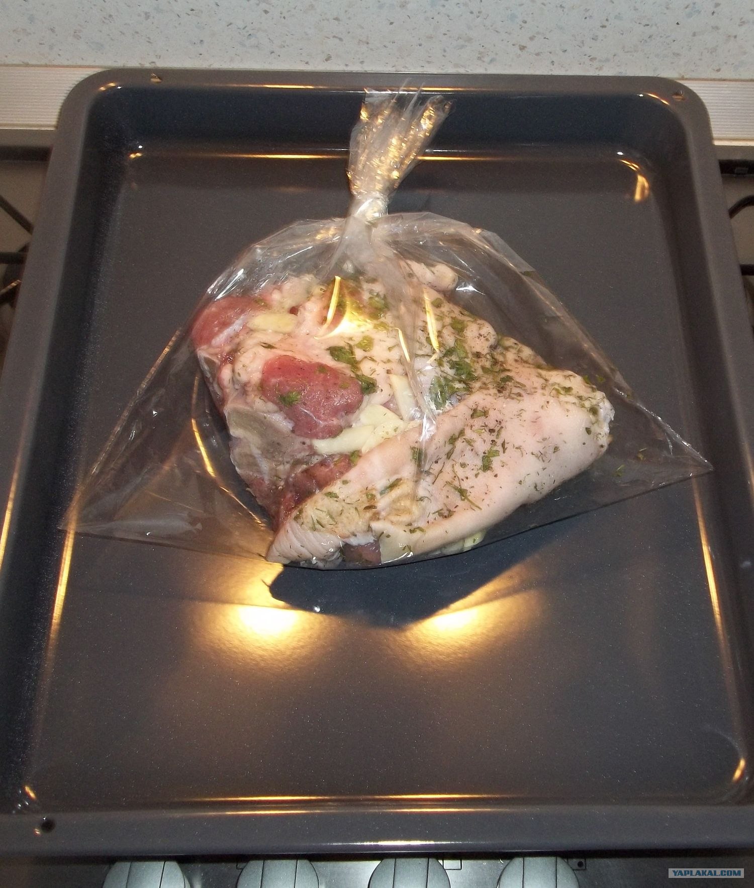 часто делаю рульку. только я ее сначала варю для надежности, а потом мариную с травками и чесночком ночь и запекаю или на решетке румяню...надо будет в пакете попробовать