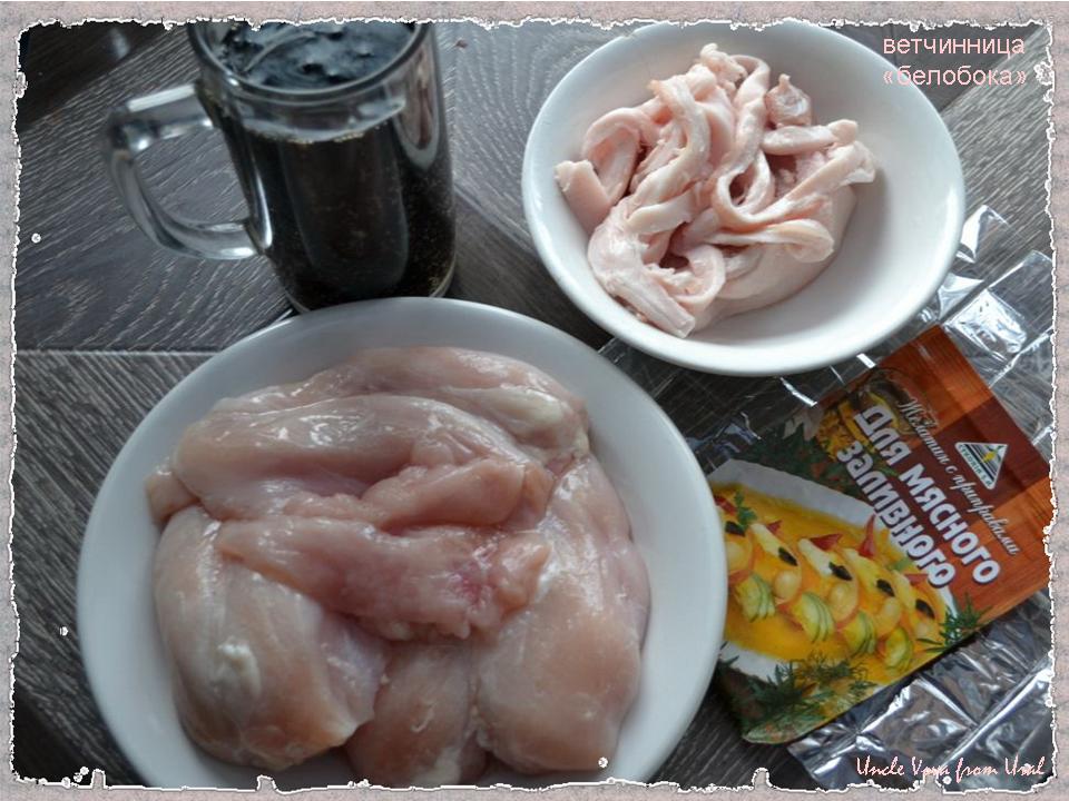 Короче, это пока мой любимый рецепт домашней ветчины. И делается быстро, и результат, скажем прямо, оченно радует. Ну вот смотрите сами. Здесь три куриные грудки и пара горстей обрези от куска свининки. Большая кружка пига, запекательный пакет и полуфабрикат для мясного заливного. И еще чё-нить из забытого в холодильнике.