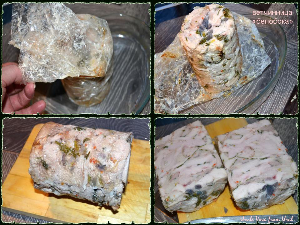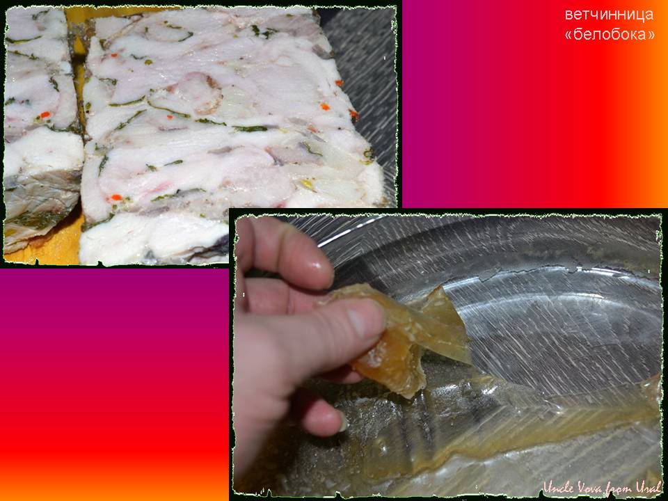 Ну вот она, какая, самодельная ветчина. А вот, то что её скрепляет. Помните желатиновое "зелье" для мясного заливного. Это его работа
