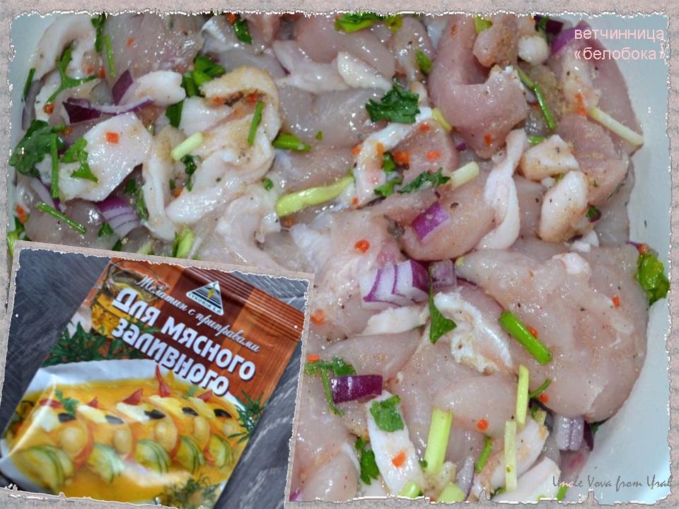 Курицу реально такими большими кусками покромсал, свининку уже помельче. В холодильнике забылось поллуковки шалота и уже начала "задумываться" разная зелень. Всё туда. Засыпаю желатиново-овощной смесью "для мясного заливного". Там и желатин, и соль, и сухие коренья морковки и сельдерея. Вот этот ингридиент нужен для того, чтобы ветчина спрессовалась, и когда остынет, то как бы окрепла. Чуток перчика... Фсио!