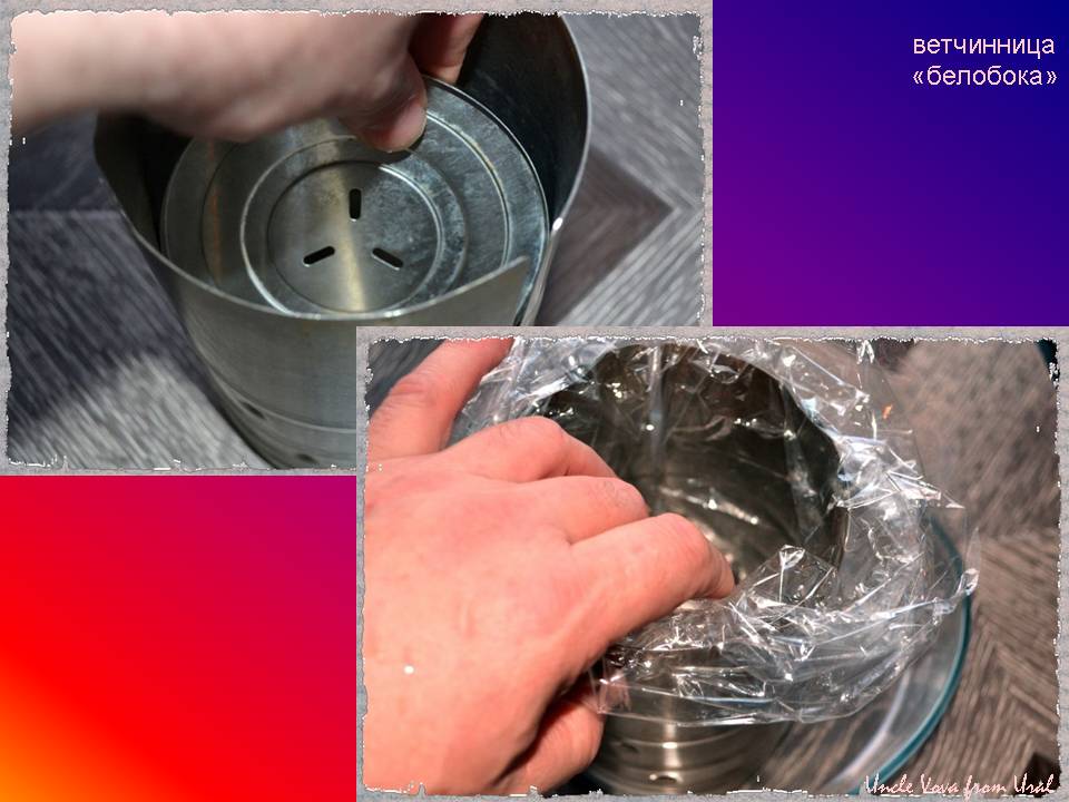 -надавливая на дно, выдавливаем наружу пакет со сформированной и готовой ветчиной.