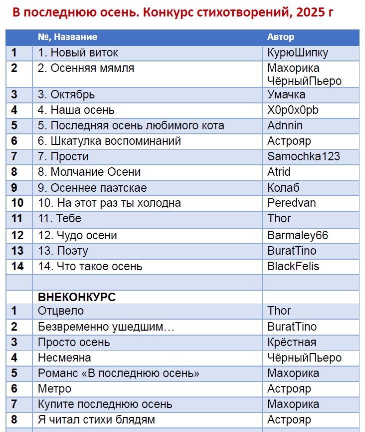 Осень ещё не закончилась, а наш конкурс стихов "В последнюю осень" завершён. Пришло время открыть имена авторов, показать результаты голосования и подвести итоги.
