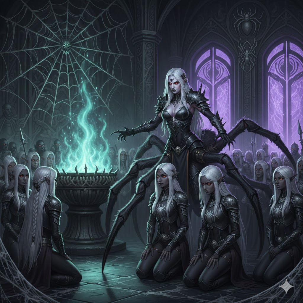Мрачная торжественность Храма Чёрной Паучихи только подчёркивалась колышущимся пламенем жертвенного огня. Тусклое зеленоватое пламя едва освещало огромный зал храма, но это не волновало никого из присутствующих. Сейчас тут находились лишь сама Ллос, принявшая привычный образ паучихи с торсом женщины, и её первожрица.