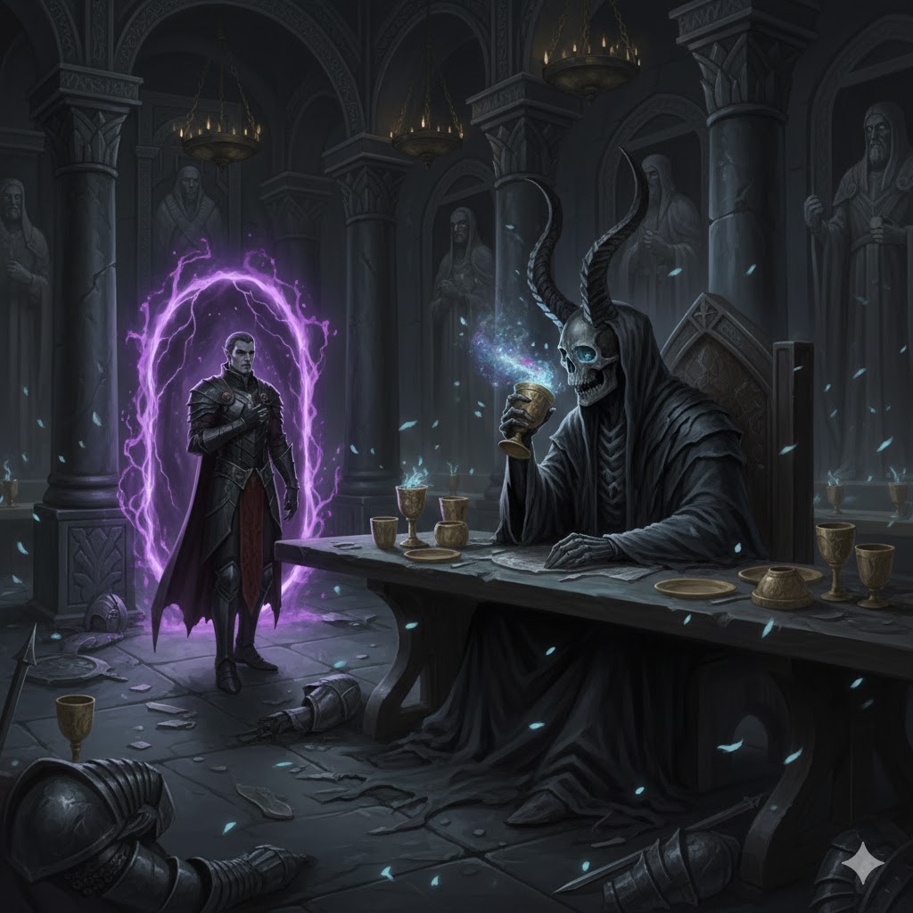 Сейчас мрачная торжественность пиршественного зала, предназначенного для встреч богов, выглядела жутко неуместной. Возможно, такое впечатление складывалось из-за того, что на этот раз зал был пуст. Настолько пуст, что это казалось неестественным. Впрочем, не совсем пуст — за одним из столов сидел Нидил, единственный, кто явился на очередную встречу богов, и вид его был тяжелым. Звенящая тишина окружала Бога Жуткой Холодной Смерти. С этим-то угрюмым настроем сидел он за столом, изредка прикладываясь к адамантитовому кубку со Звёздным Нектаром.