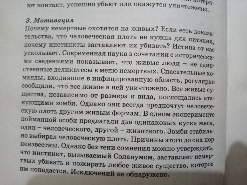 Далее. Зачем они вообще охотятся? У них нет сознания, что так интереснее жизнь, нет вкусовых рецепторов. Ни одно существо (включая человека) не бежит добывать себе пищу сложно, если можно получить ее просто. Но у человека есть разум и воля. Он может встать с дивана, отказаться от доставок и приготовить салатик и правильное мясо. Но зомби не может! Смысл ему шляться по ночам, ловить людей, высасывать мозги? Чтобы двигаться лучше? А ему зачем?