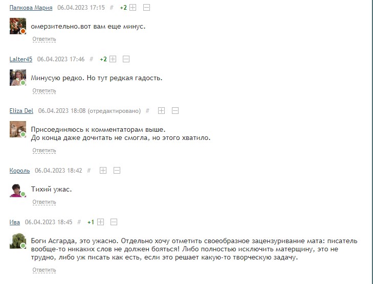 Прочёл отзывы на это крео, рыдал ну реально. Это насколько надо быть высокоморальным( подумал я, совсем о другом, но не буду, а то йобнутся ещё и от моего комма в обморок) могут впасть в истерику от ржачного в принципе крео. Слоны, вообще похоже не способны на стёб. Только пуканье единорога бабочками, только в вакууме, и только на другой планете! Вот это во нашему! Всё остальное ересь и точка ( с их слов) Думаю прибежали поклонницы Дарьи Донцовой и журнала « Домохозяйки черноземья» высказали, своё фи и фу. Ну и понеслось. Ну не суть, вся комичность ситуации, в том, что эти люди, подозреваю что ( непорочно зачатые) для которых мат не приемлем. Обзывали автора и зуммером, и хрен пойми кем. А не обсуждали крео. Хотя правилами это запрещено. «Весёлые» конечно противники у ЯПа. Не чего сказать.