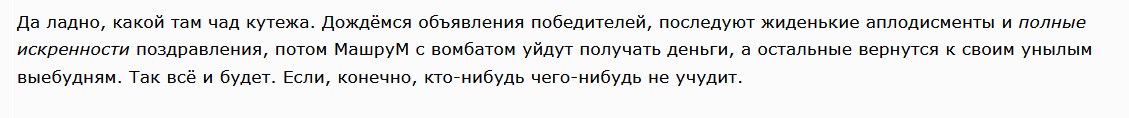 Меня пугали разочарованиями в людях, растоптанными мечтами и надеждами и купленным всем. Но разочарований не случилось, все три рассказа, занявших первые места мне понравились) За два из трёх голосовала) По крайней мере, собиралась)) Я так долго металась между своими фаворитами, что уже не помню, каким точно голоса отдала.