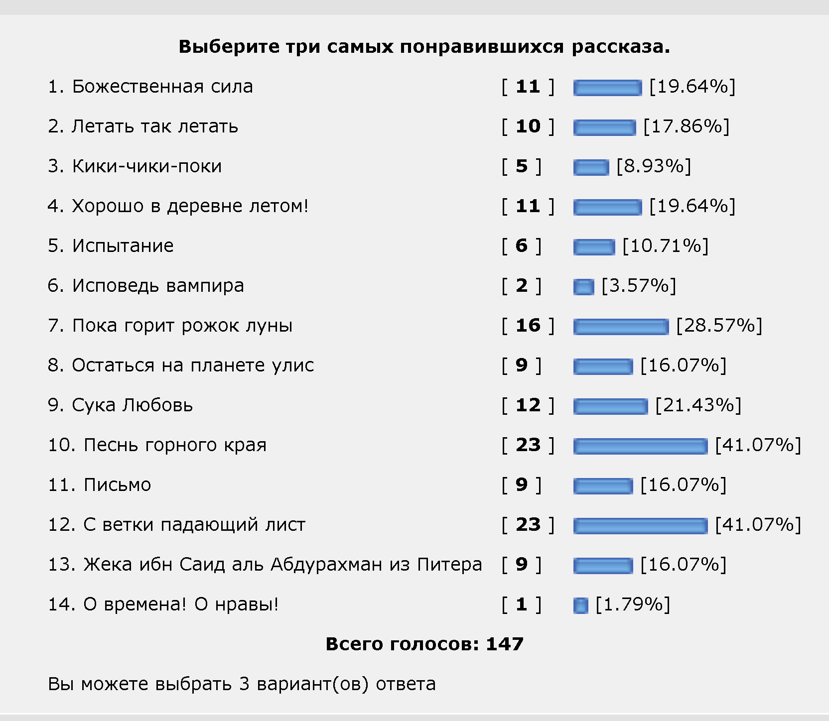 Тьма, не расстраивайся, читательская любовь – вещь весьма непостоянная и непредсказуемая. В другой раз у тебя обязательно выйдет гораздо больше голосов. ) Оставайся с нами и, возможно, тебе удастся покорить местную публику.
