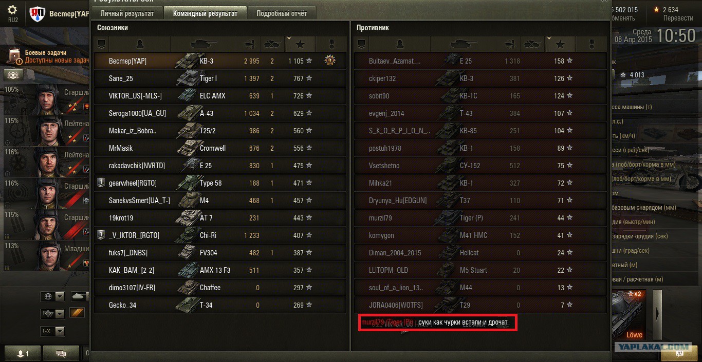 Открыл, ага gigi.gif Вчера очень хотел закрыть))) Ибо как он ползает... Наверно, это подготовка пукана к КВ-4 lol.gif Да и дестроер этот... То всем накидываешь, а то начинается: не пробил, рикошет, попадание. Да вообще хрен поймешь картошку. Вчера выгнал унитаза покустодрочить. Когда бронебойный отскочил от М7, я малость удивился(болванка, бл@ть, 105мм от говна картонного отскочила) blink.gif Потом вспомнил советы более опытных унитазоводов и врубил голду. И всех наказал, кто к нашей базе лез. Из кустов и на голде)) Ну разве что не статист))) А вот еще... Что интересно, их 47% "герой" на А-44, находясь в пределах круга моего обзора, из засвета пропал, но меня он видел отлично и засветился только после выстрела. На ходу...