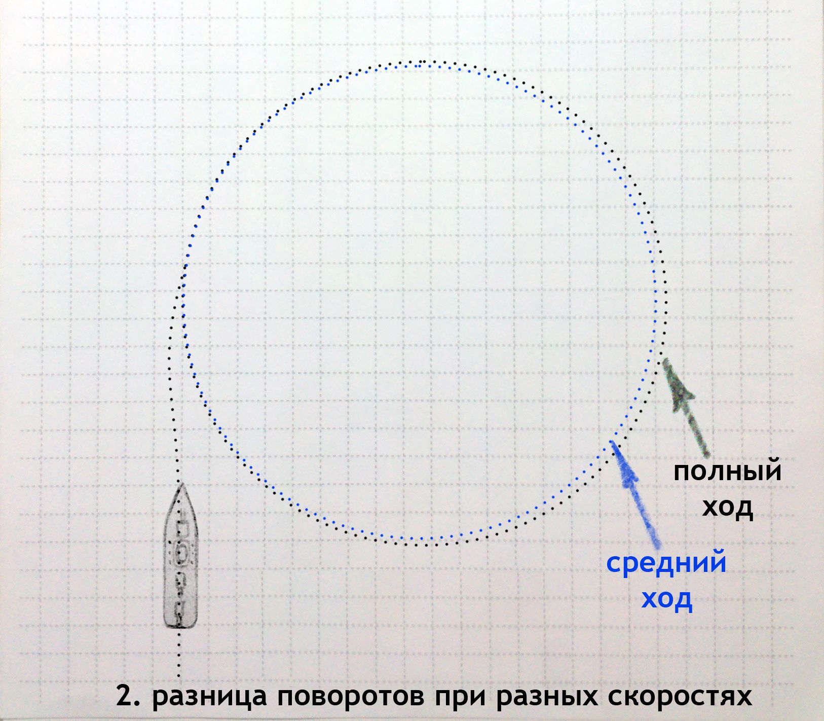 В реале там столько сил роль играет.. Если маленькая лодочка разворачивается быстрей с большей скоростью, то большой корабль уже испытывает сильную инерцию и его при увеличении скорости "вытаскивает", увеличивая циркуляцию..