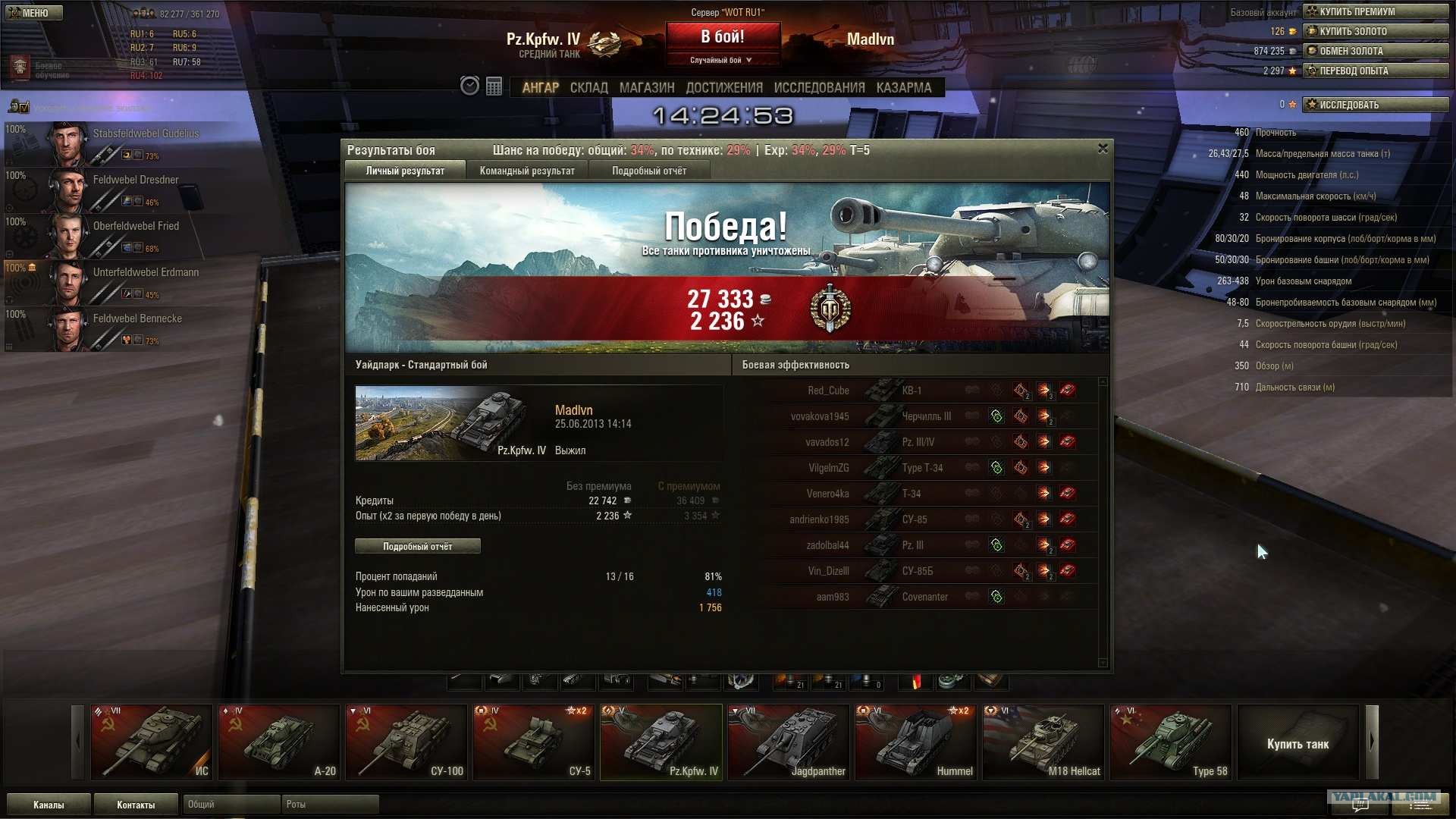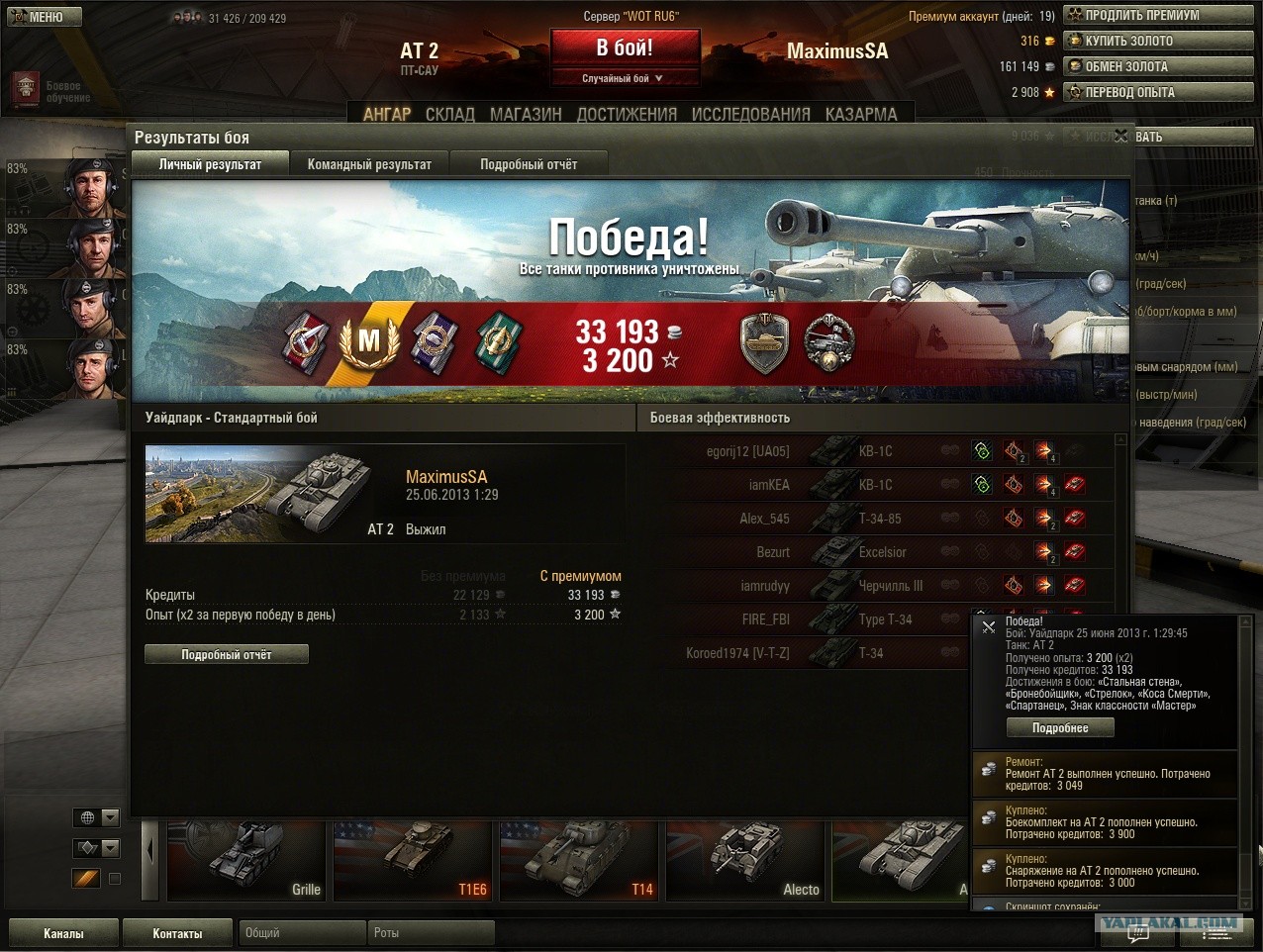 Решил прокатиться на своей АТ2 и был очень приятно удивлён исходом боя. Определённая нервозность была конечно, особенно в тот момент, когда осталось 17хп и мы нос к носу с КВ-1С, которого я как на зло не добил. Благо союзник не дремал и таки добил его, прежде чем он меня :)