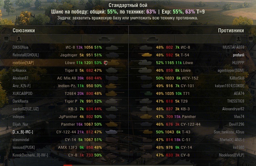 Даже командира когда-то встретил. Заинтересовался, ибо уж очень сильно вонял в чате (правда по итогам боя на ТТ 10 выстрелов и одно попадание). Оказалось, что у главы клана около 600 РЭ и 46% побед