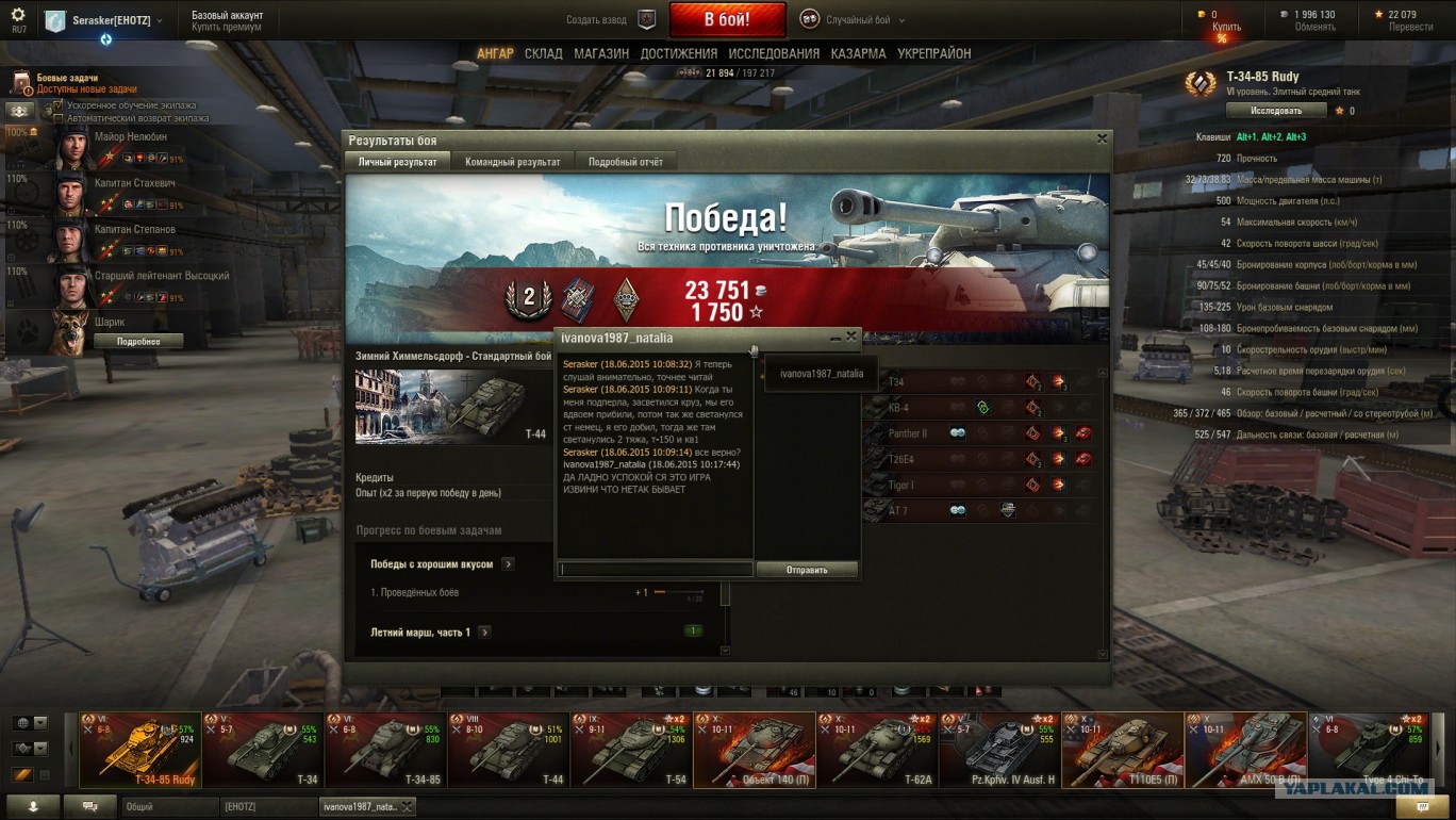 До этого, в бою, фланг один полностью оставили, я решил туда пойти. Это девушка на су-100 подползает сзади со словами - иди свети вниз т-34-85 и толкает меня ) дальше в скрине все описано ) в общем я оставил их втроем против 2 тяжей, а сам поехал спасать центр, поспасал немного и в ангар ) окружили. Смотрю - а 2 тяжа то вражеских живы О_О а эти чудики слились )) так эта девушка орала на всех, что мы все олени. Я ей сказал, что она не лучше, их там было 2 против 3-х. Она говорит, что врагов было четверо! О_О 2 тяжа, 1 ст и светляк ))) она походу посчитала и тех, кого грохнули в самом начале ))) Девушки, милые, не надо был блондинками, пожалста ) видно же все.