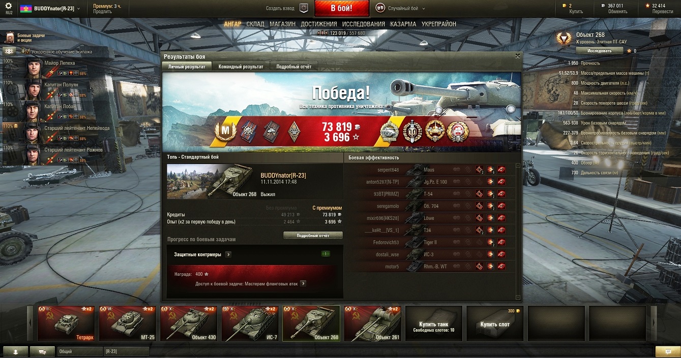 Хз, статистика такая, наверное потому что играю только десятками одними в рандоме, но, как и говорил..мне она безразлична. Вот мой ангар. Этим составом играю уже ..ну очень продолжительное время.