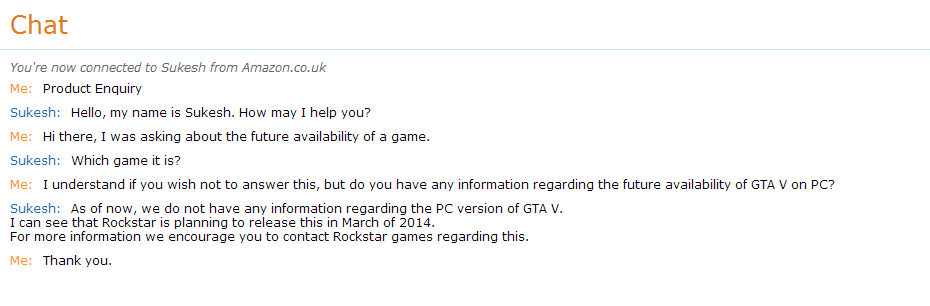 «Добро пожаловать в Amazon Chat. Меня зовут Фатима [...]. Как нам известно, GTA V для ПК будет анонсирована 12/24 и, в соответствии с нашим источником, релиз игры состоится 03/12 в США и 03/14 в Германии», - сообщила сотрудница поддержки Amazon.