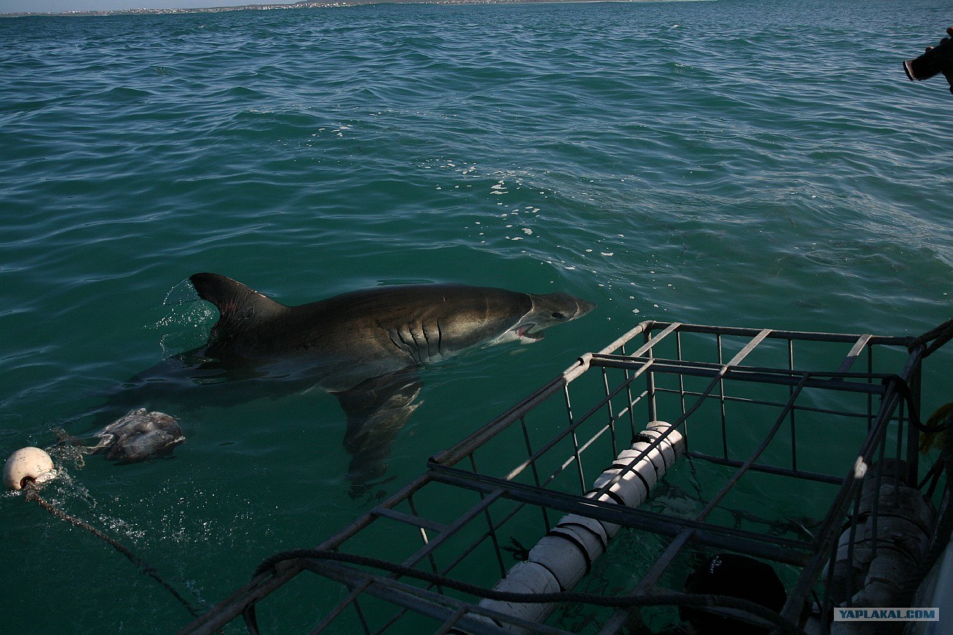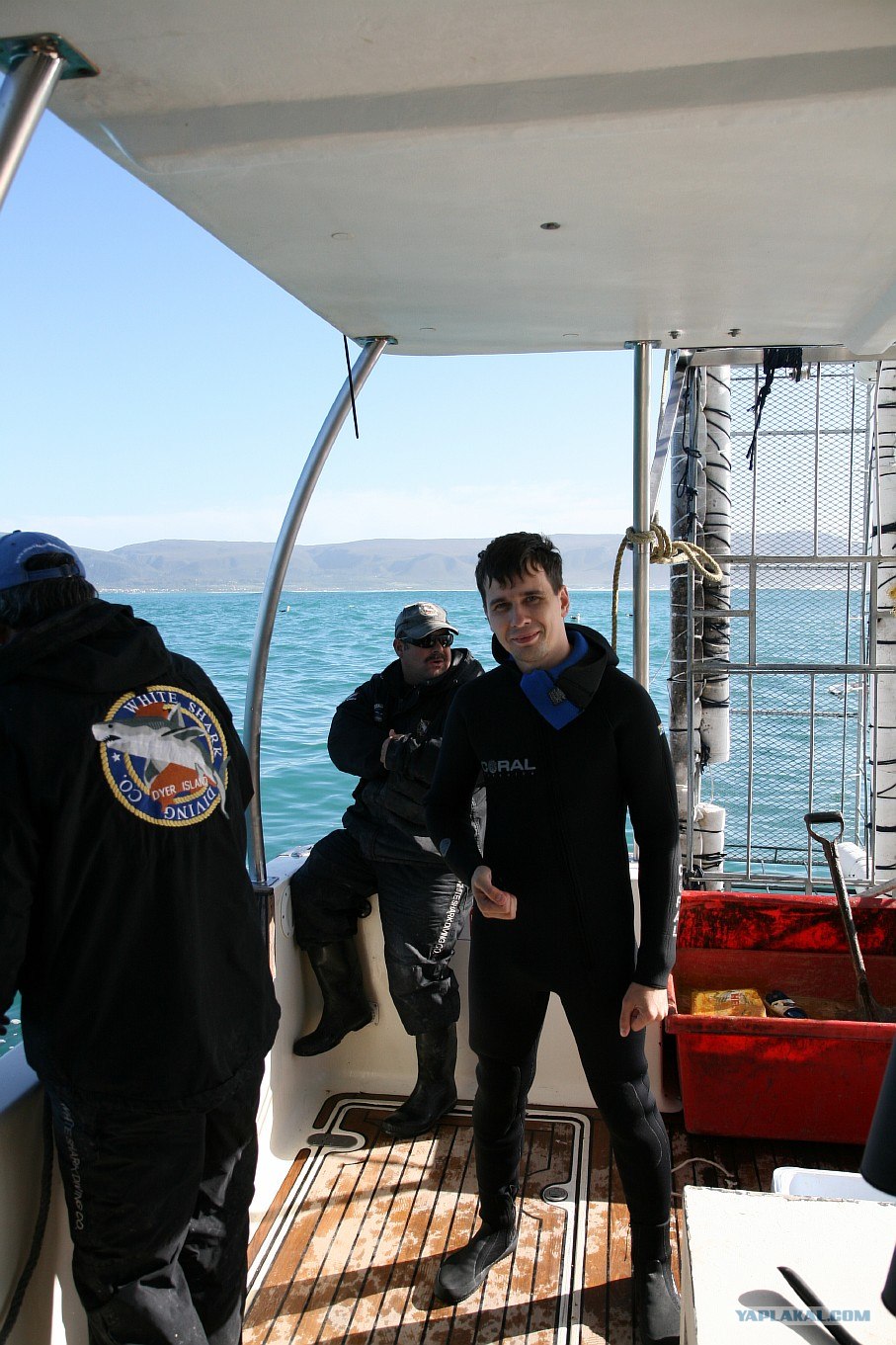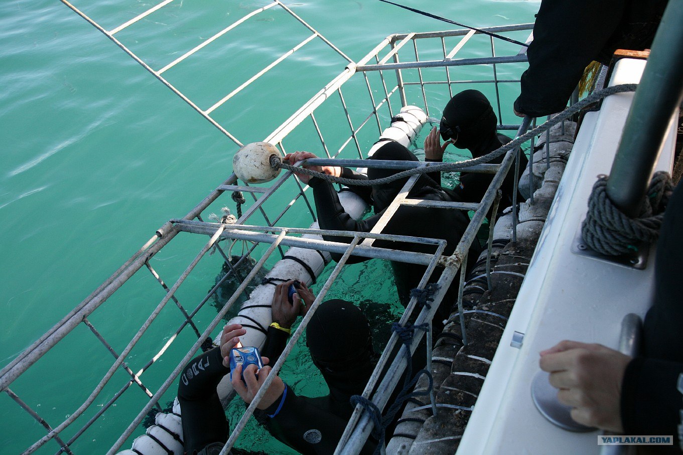Итак, суть дайвинга с акулами! Вывозят тебя в открытый океан прикармливают зубатых киллеров и ждут. Как только эта 4-6 метровая махина начинает нарезать круги вокруг лодки, клеть спускают в воду и трамбуют туда несчастных, но довольных туристов. Теперь фото.