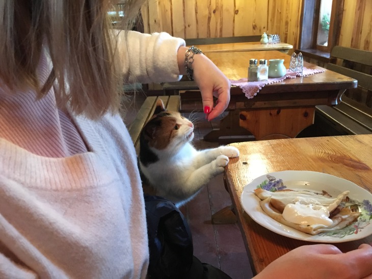 В Изборске заглянули в блинную. Там был такой котейка.