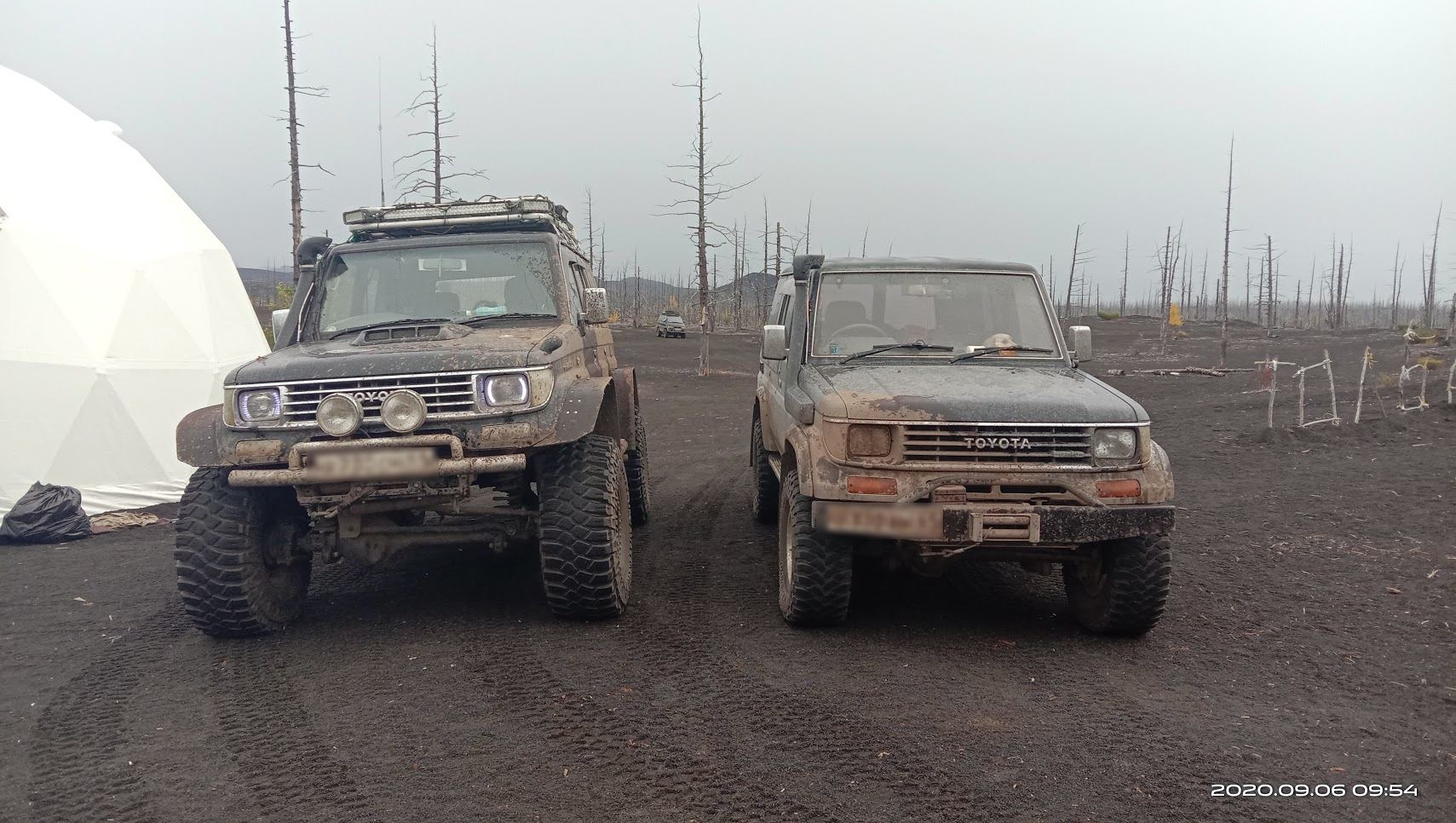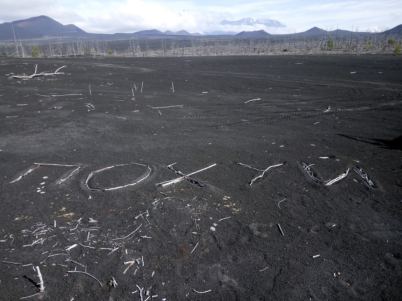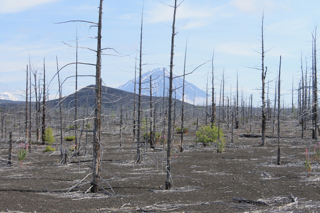 Это уже спустились с Толбачика, около 10 км от него. Называется мертвый лес. Извергался вулкан около 80 лет назад был большой выброс пепла и лавы, накрыло лес и вот, что стало. Для справки, это верхняя треть дерева. там примерно на 10 метров до самой земли))
