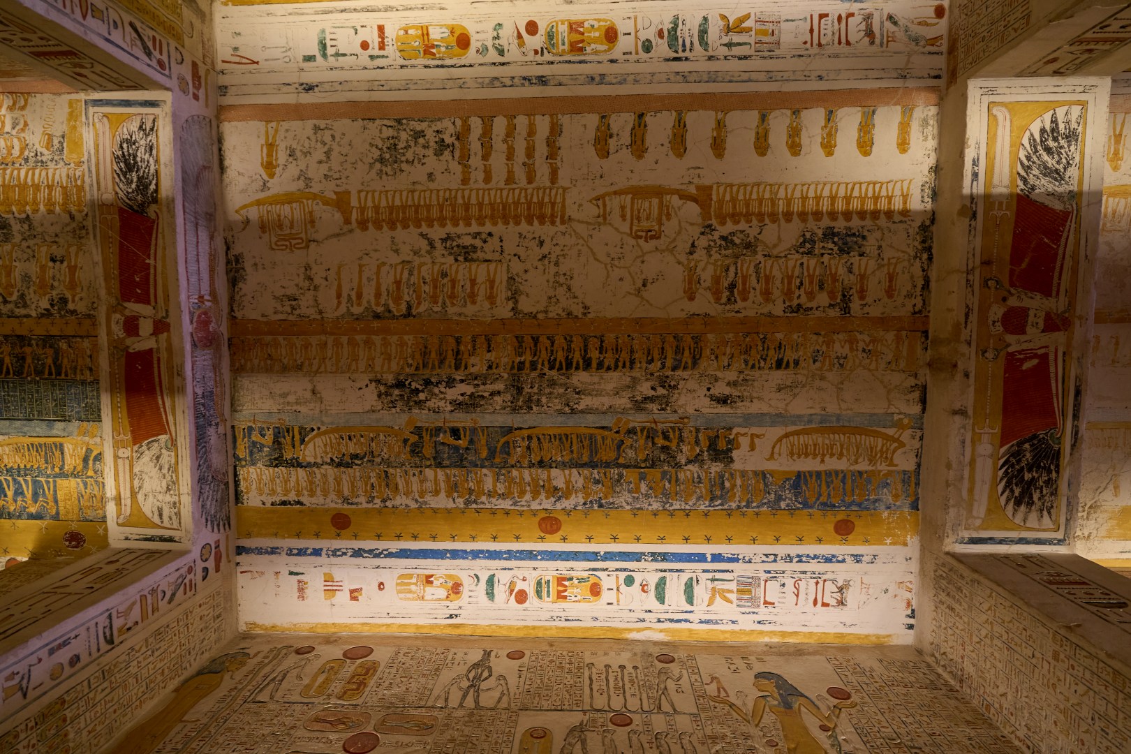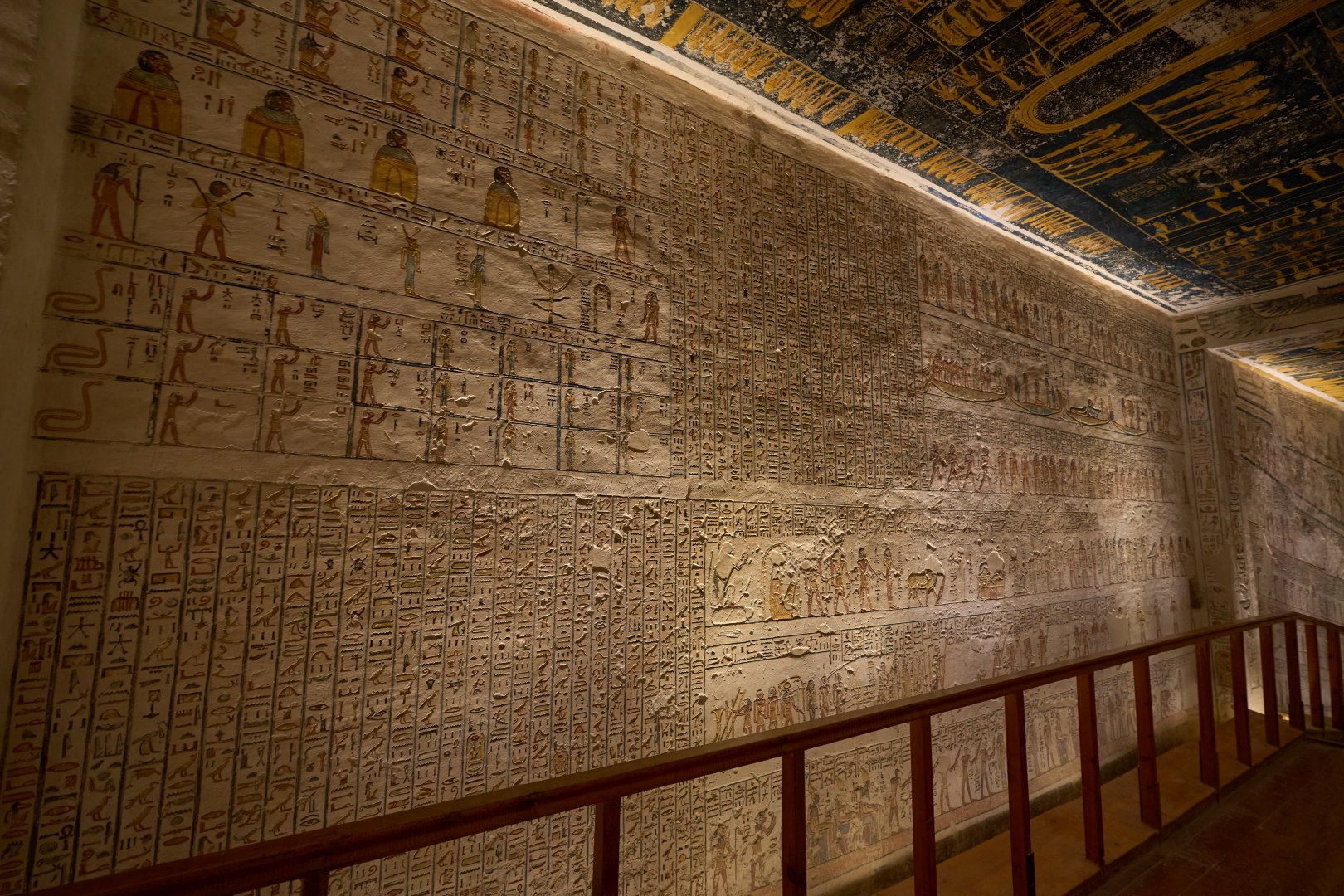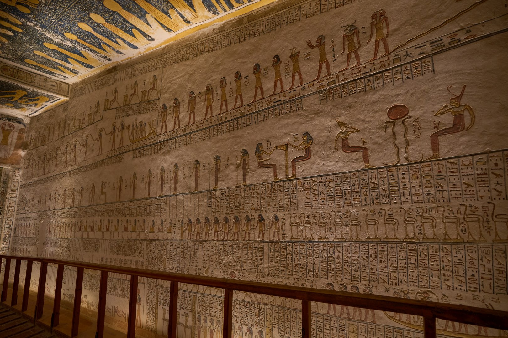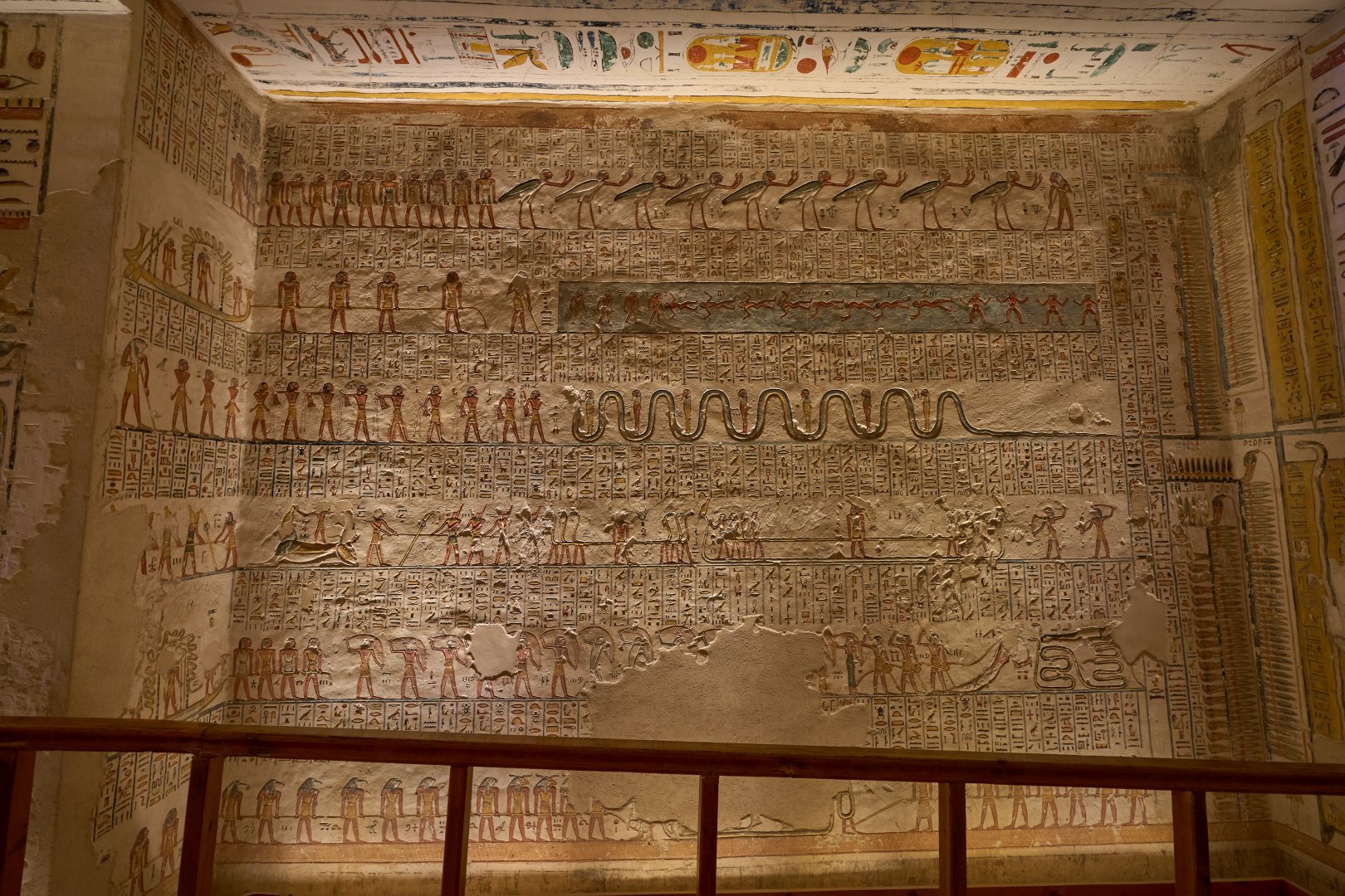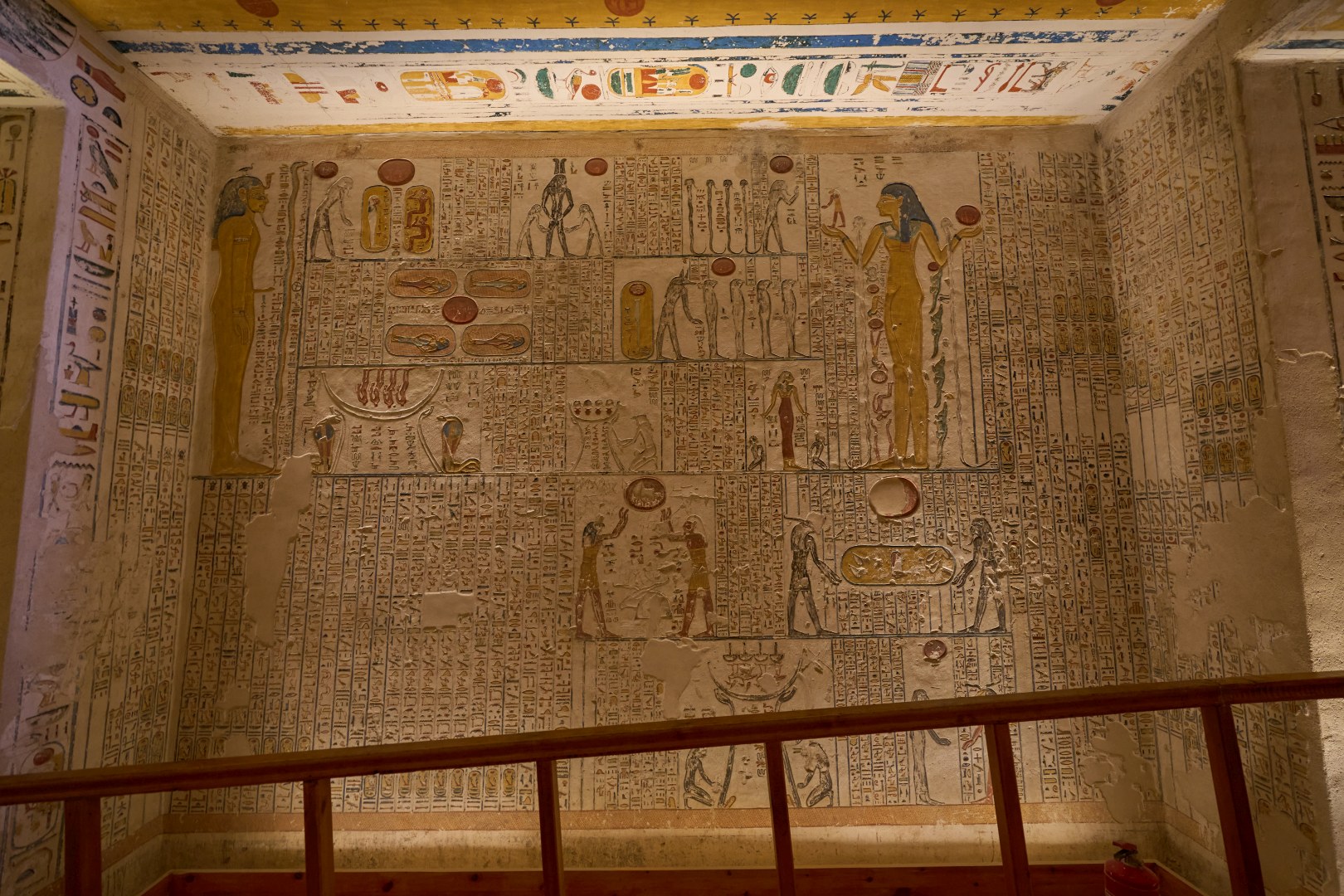 110. Следующая гробница которую я посетил была гробницей сразу двух фараонов XX династии - Рамсеса V и Рамсеса VI. Правление обоих этих фараонов было относительно коротким и не особо интересным. Рамсес V не успел завершить свою гробницу, так что её достраивал Рамсес VI и использовал для себя. В целом эти времена были закатом Нового царства и ситуация в Египте была не спокойной. Сохранилось не так много документов того периода и многие страницы биографии этих фараонов остаются под вопросом.