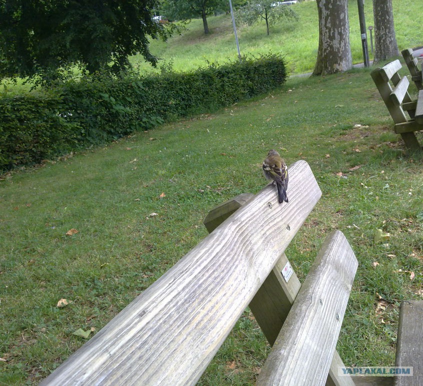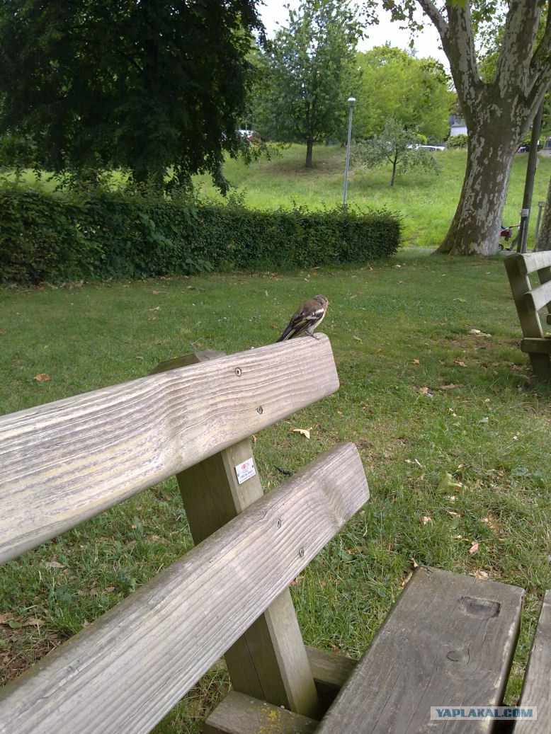 Ладно, хорош негатива. Поделюсь лучше сегодняшним. Благо что расписание иногда позволяет и среди недели уютно примостится в парке на скамейке с чтивом. И внезапно вот такой пернатый товарищ не только присоседился, а еще и остался на несколько минут. Я думал, они к людям не очень того?